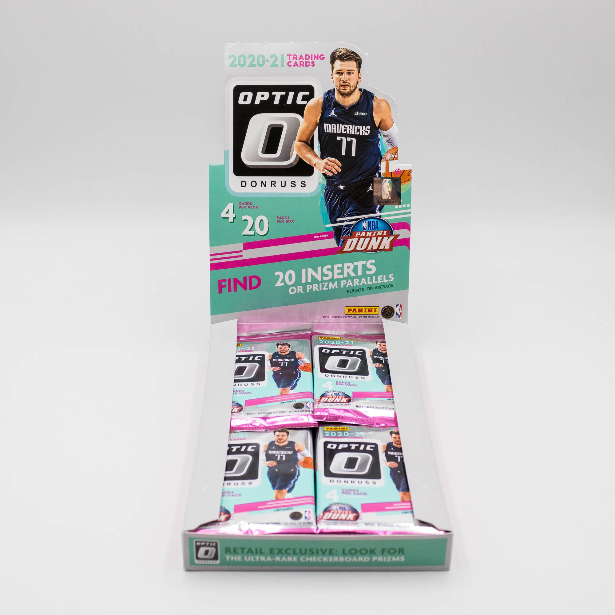 Find 20 Inserts or Parallels in each Donruss Optic Retail Box! Look for the Retail Box Exclusive 1-of-1 Black Prizm for Base and Base Rated Rookies. Retail Boxes are the only place to find the one-of-a-kind Rated Rookies Signatures Black of top rookies from the 2020 NBA Draft!