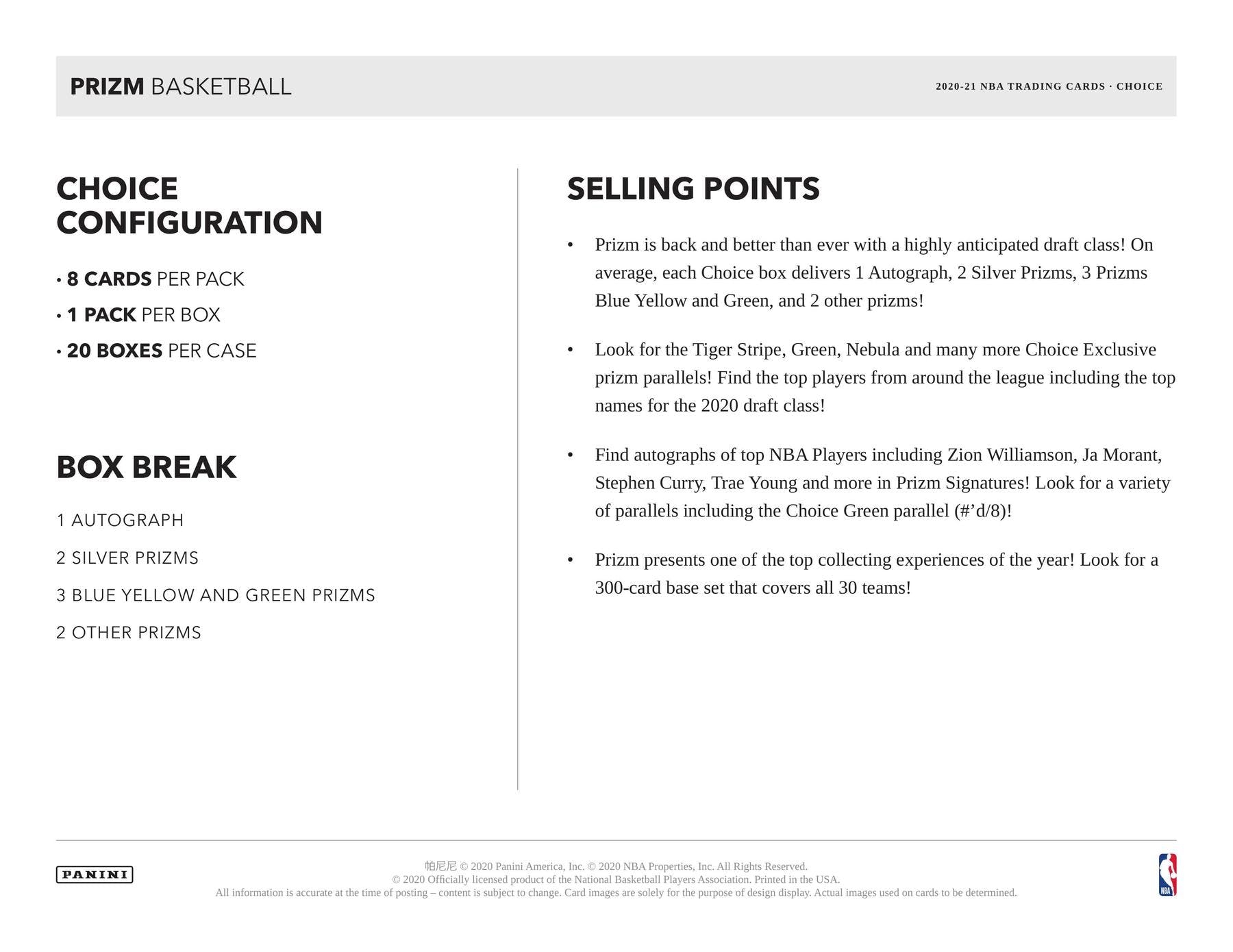 Factory Sealed 2020/21 Panini Prizm Choice Basketball Hobby Box mit 1 Packs Per Box, 8 Cards Per Pack.