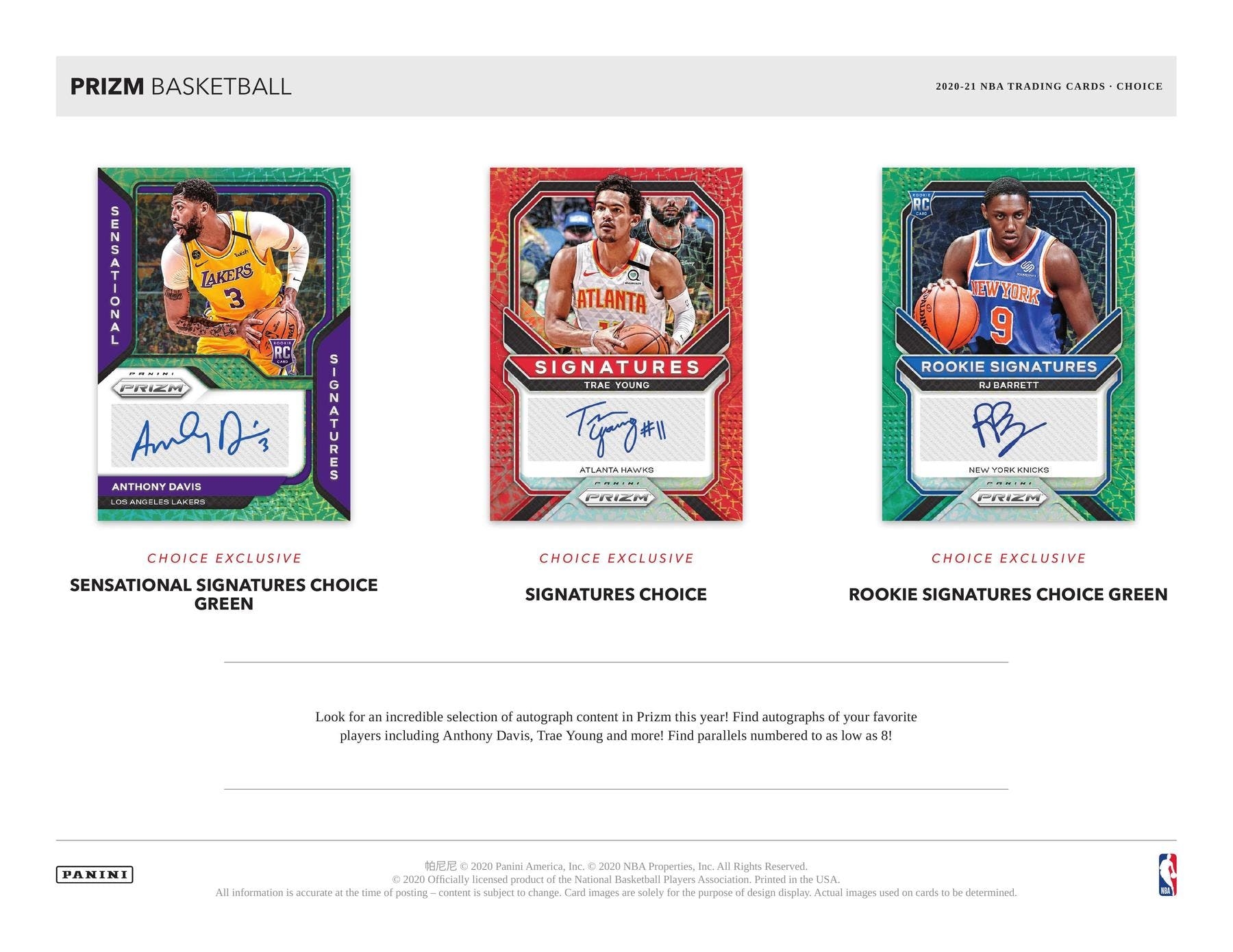 SENSATIONAL SIGNATURES CHOICE GREEN/SIGNATURES CHOICE/ROOKIE SIGNATURES CHOICE GREEN: Look for an incredible selection of autograph content in Prizm this year! Find autographs of your favorite players including Anthony Davis, Trae Young and more! Find parallels numbered to as low as 8!