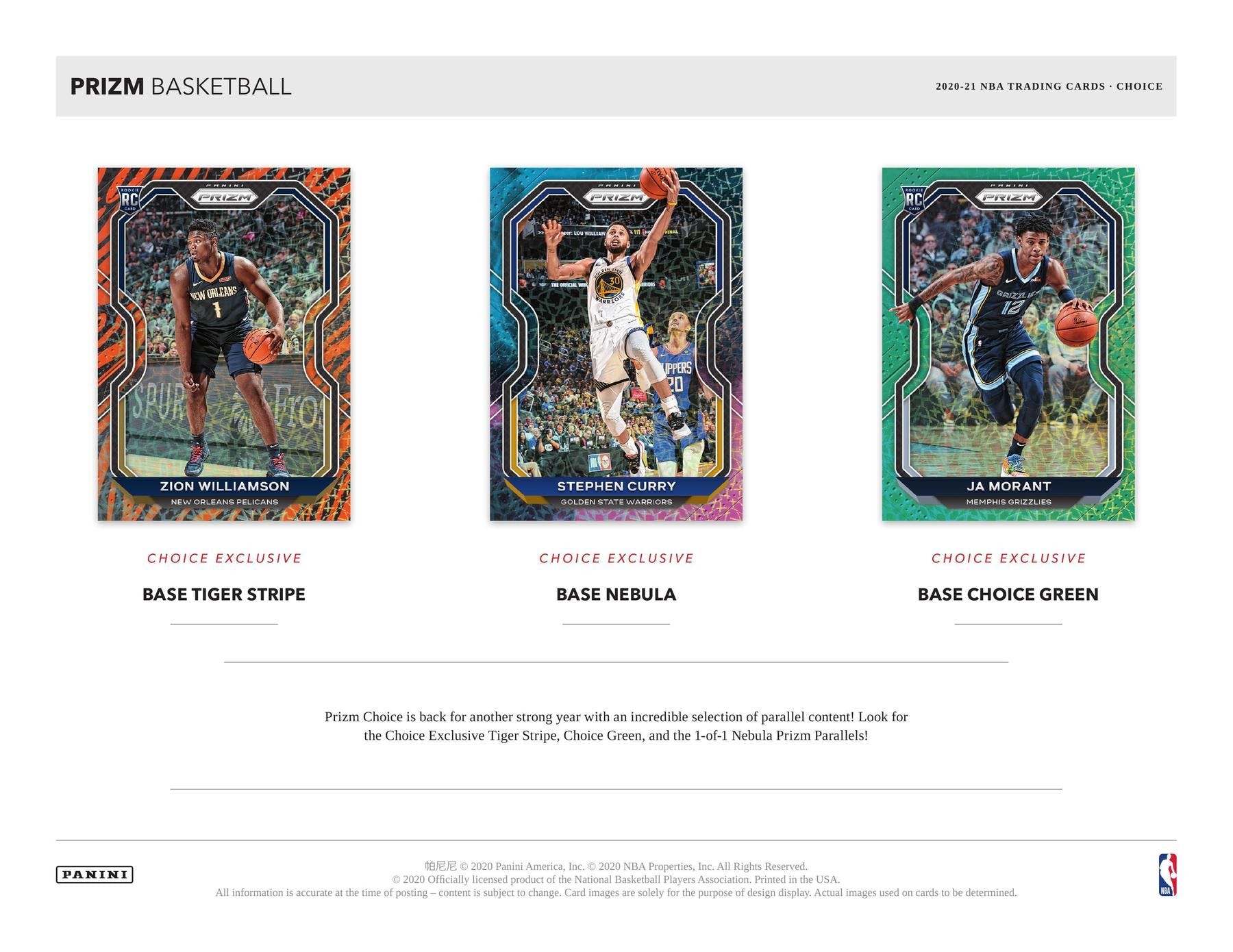BASE TIGER STRIPE/BASE NEBULA/BASE CHOICE GREEN: Prizm Choice is back for another strong year with an incredible selection of parallel content! Look for the Choice Exclusive Tiger Stripe, Choice Green, and the 1-of-1 Nebula Prizm Parallels!