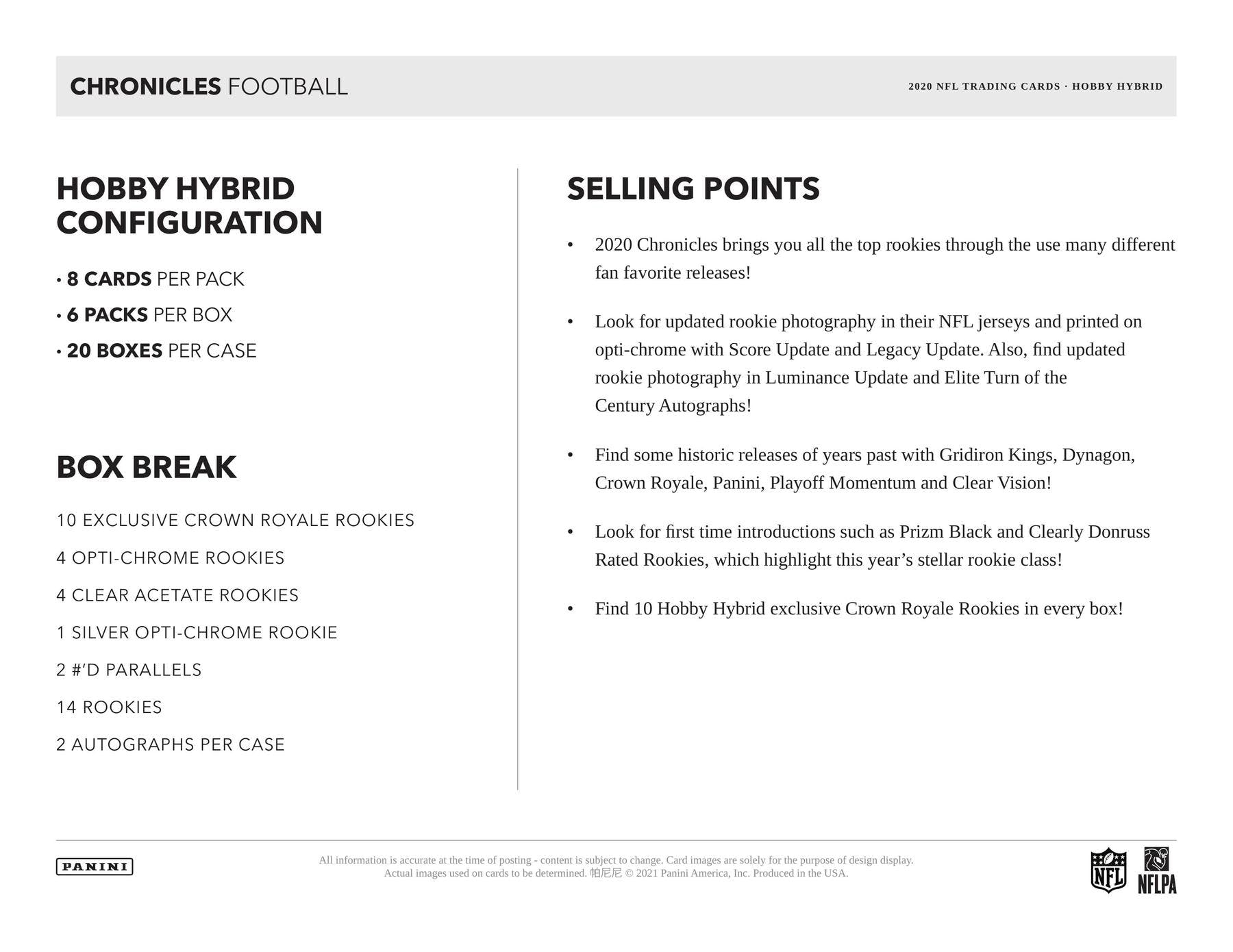 Factory Sealed 2020 Panini Chronicles Football Hobby Hybrid Box mit 6 Packs Per Box, 8 Cards Per Pack.