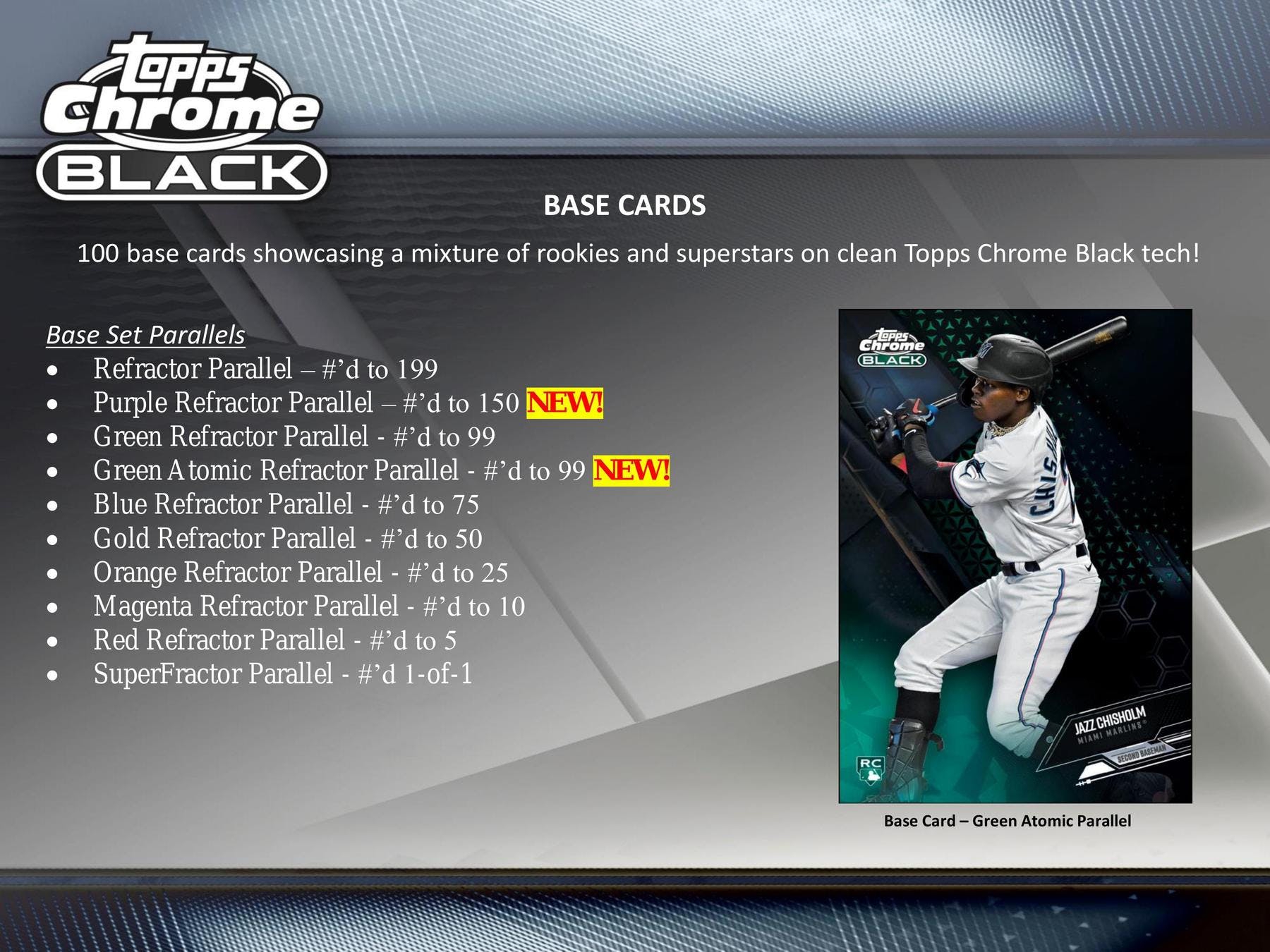 100 base cards showcasing a mixture of rookies and superstars on clean Topps Chrome Black tech!