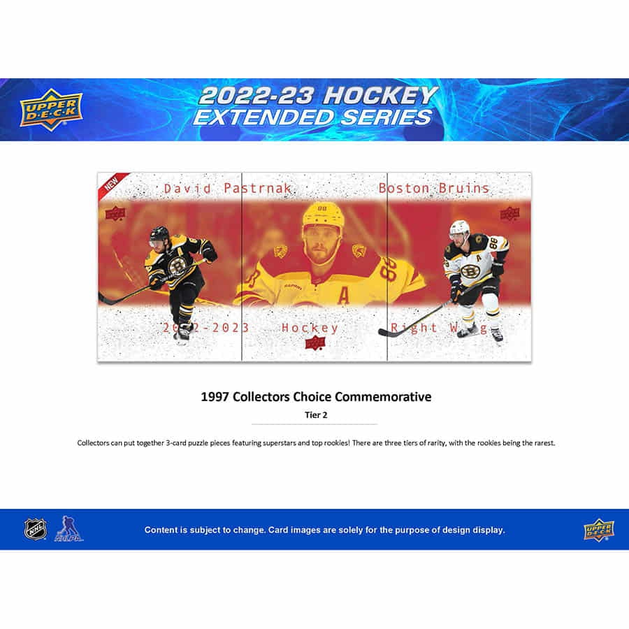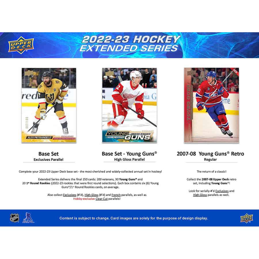 Die Extended Series enthält die finalen 250 Karten: 200 Veteranen, 30 Young Guns und 20 1st Round Rookies (2022-23 Rookies, die in der ersten Runde ausgewählt wurden). Jede Box enthält durchschnittlich 6 Young Guns/1st Round Rookies-Karten.