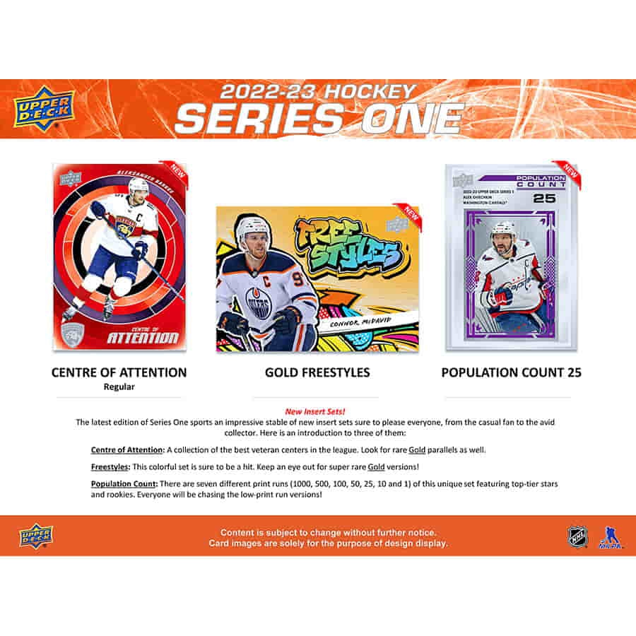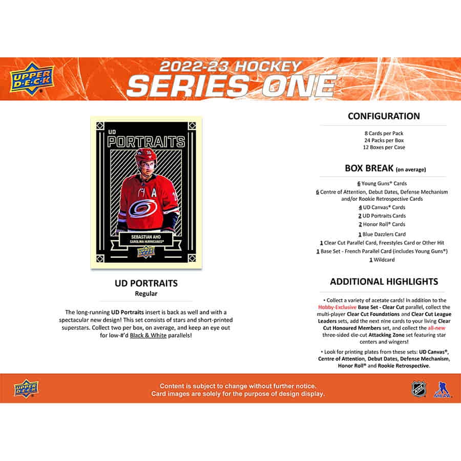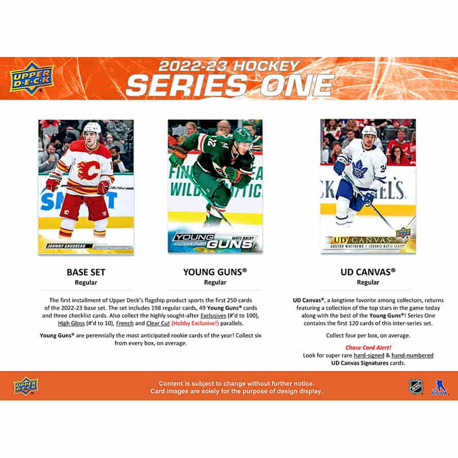 Die erste Ausgabe von Upper Decks Flaggschiffprodukt enthält die ersten 250 Karten des Basissets 2022-23. Das Set enthält 198 reguläre Karten, 49 Young Guns-Karten und drei Checklistenkarten. Sammelt auch die begehrten Exclusives (#'d bis 100), High Gloss (#'d bis 10), French und Hobby-exklusive Clear Cut-Parallelen.