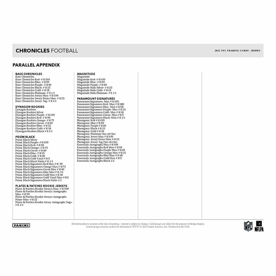 PRIZM BLACK: Fan Favorite Prizm Black is back in 2022 Chronicles Football! Hunt all of the Parallels #'d/199 to 1! Look for rare autograph parallels as well!