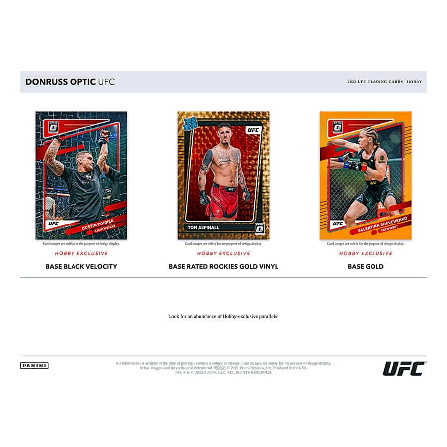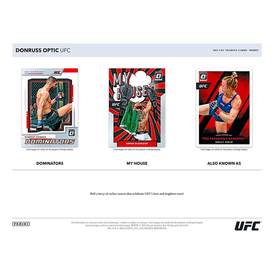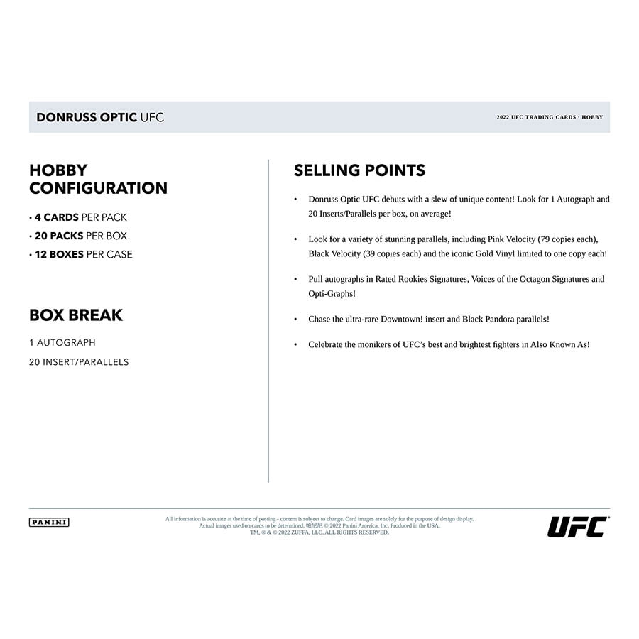 Eine originalverpackte (OVP) Sammelkarten Box von 2022 Panini Donruss Optic UFC Hobby Box mit 20 Packungen per Box, 4 Karten per Packung.