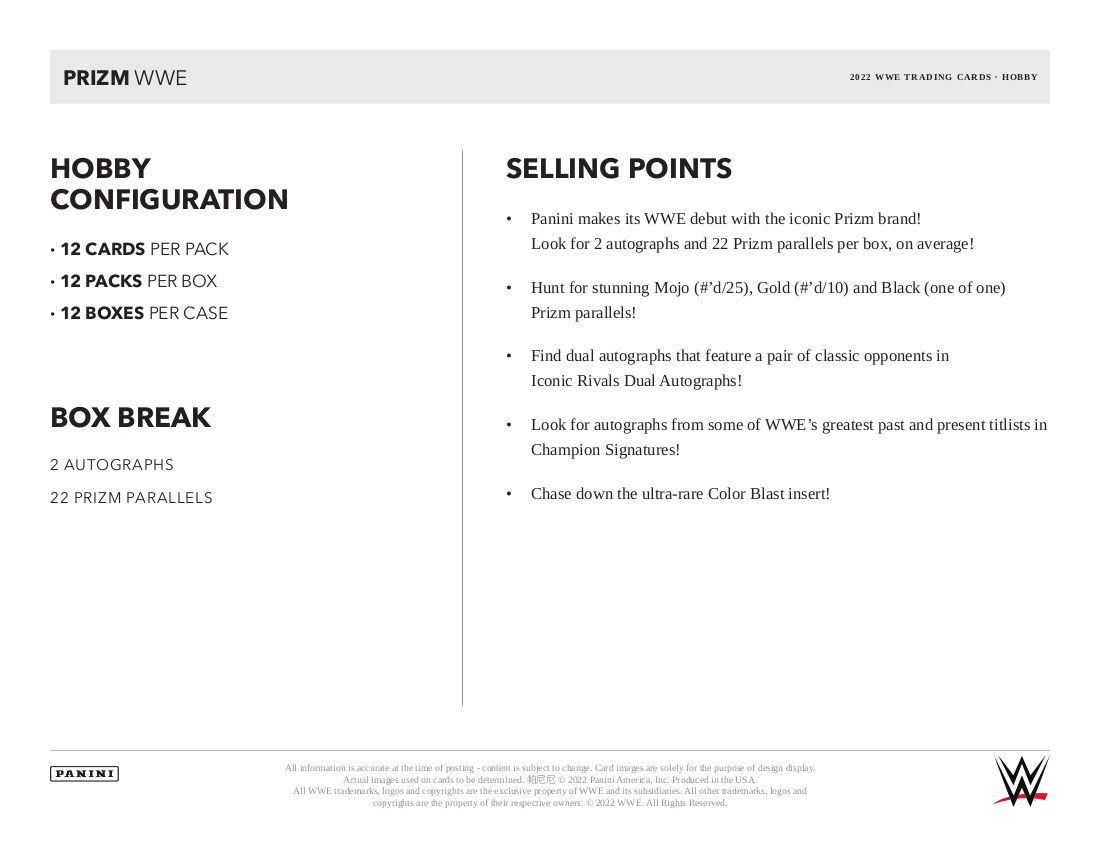 Factory Sealed 2022 Panini Prizm WWE Wrestling Hobby Box mit 12 Packs Per Box, 12 Cards Per Pack.