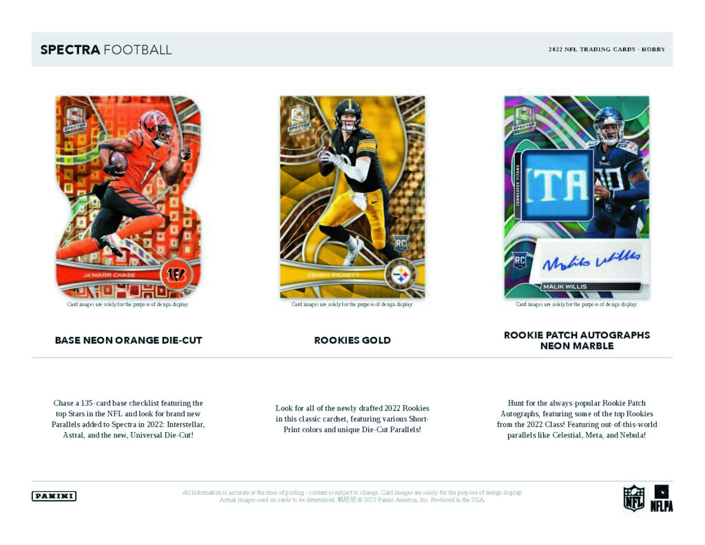 BASE: Chase a 135-card base checklist featuring the top Stars in the NFL and look for brand new Parallels added to Spectra in 2022: Interstellar, Astral and the new, Universal Die-Cut!