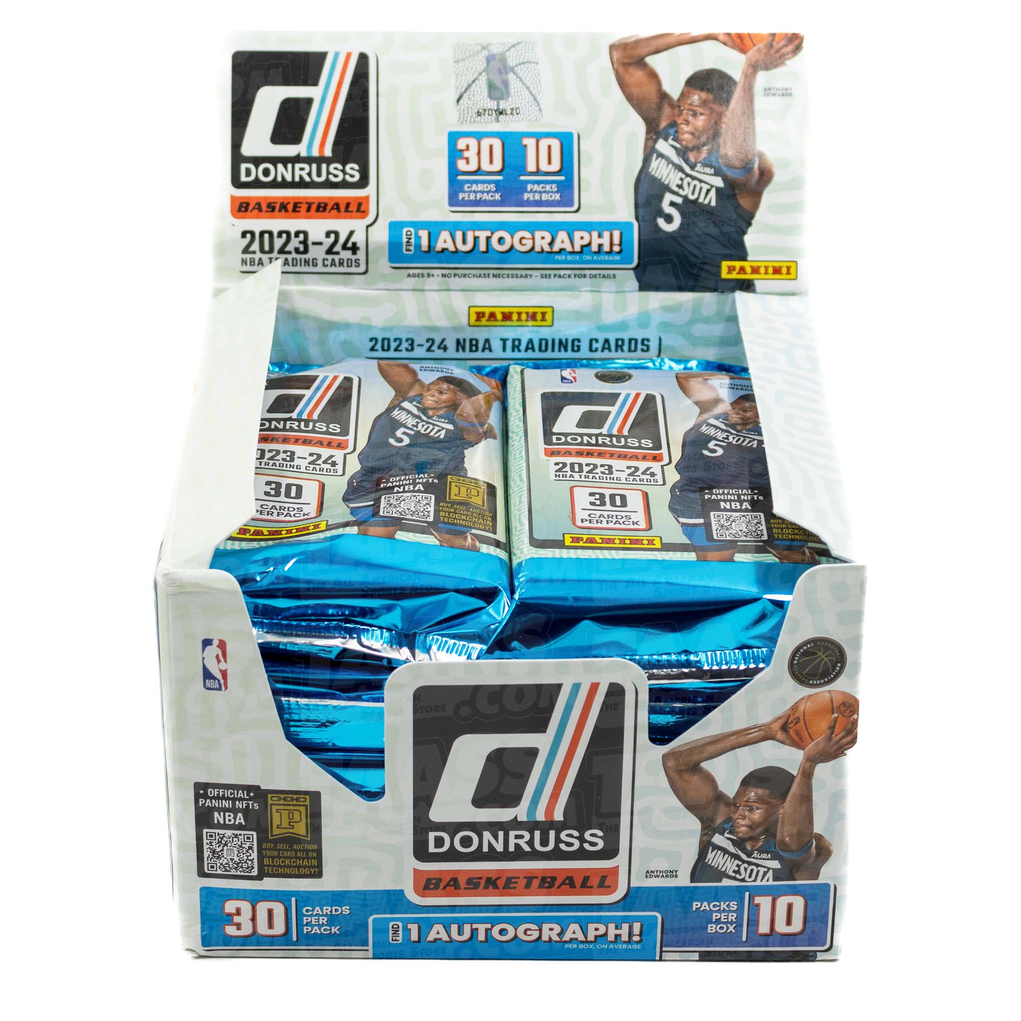 Eine originalverpackte (OVP) Sammelkarten Box von 2023/24 Panini Donruss Basketball NBA Hobby mit 10 Packungen per Box, 30 Karten per Packung.