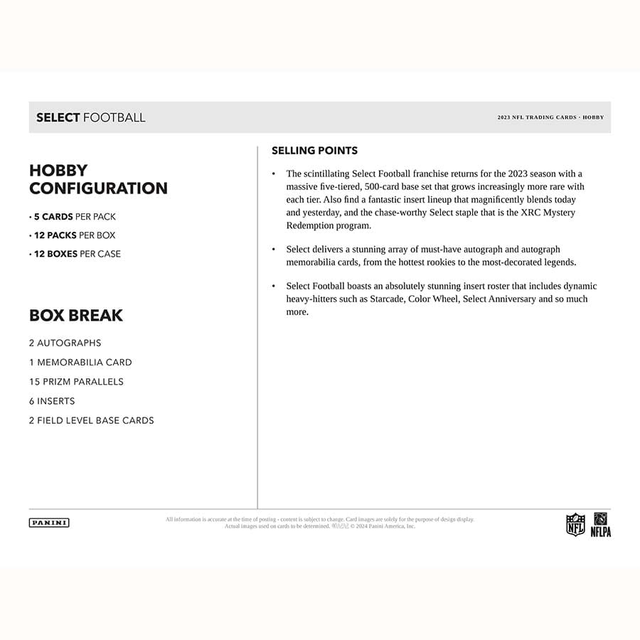 BASE: The scintillating Select Football franchise returns for the 2023 season with a massive five-tiered, 500-card base set that grows increasingly more rare with each tier. Also find a fantastic insert lineup that magnificently blends today and yesterday, and the chase-worthy Select staple that is the XRC Mystery Redemption program.