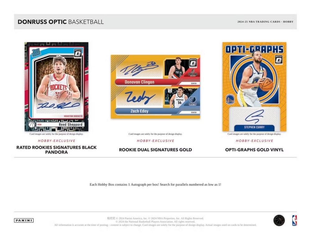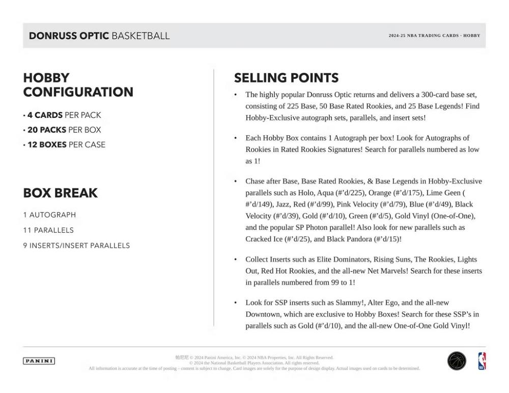 Die beliebte Donruss Optic Serie ist zurück - jetzt mit einer neuen Fast Break Box, die exklusive Parallels, Autogramme und Inserts für Sammler bereithält. Das 300-Karten starke Base Set besteht aus 225 Base Cards, 50 Rated Rookies und 25 Base Legends.