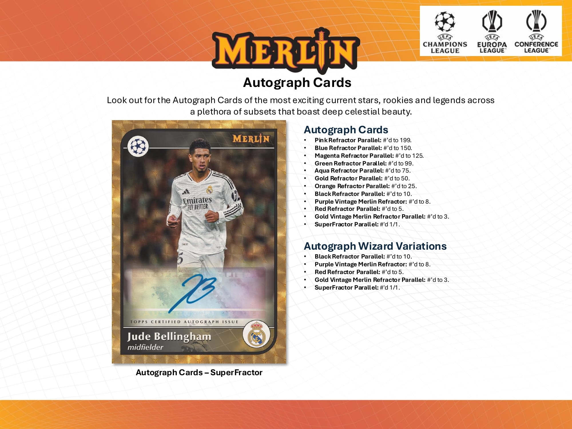 Diese Serie richtet sich an Sammler, die Design, Geschichte und Exklusivität schätzen. Mit starken Inserts, hochwertigen Autogrammen und echten Matchball-Relics ist Merlin Chrome UCC 2024/25 ein absolutes Muss für Fußballkarten-Fans und perfekt geeignet für Einzelboxen, Displays und Live Breaks.