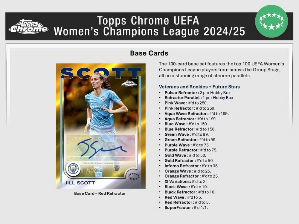 The 100-card base set features the top 100 UEFA Women's Champions League players from across the Group Stage, all on a stunning range of chrome parallels.