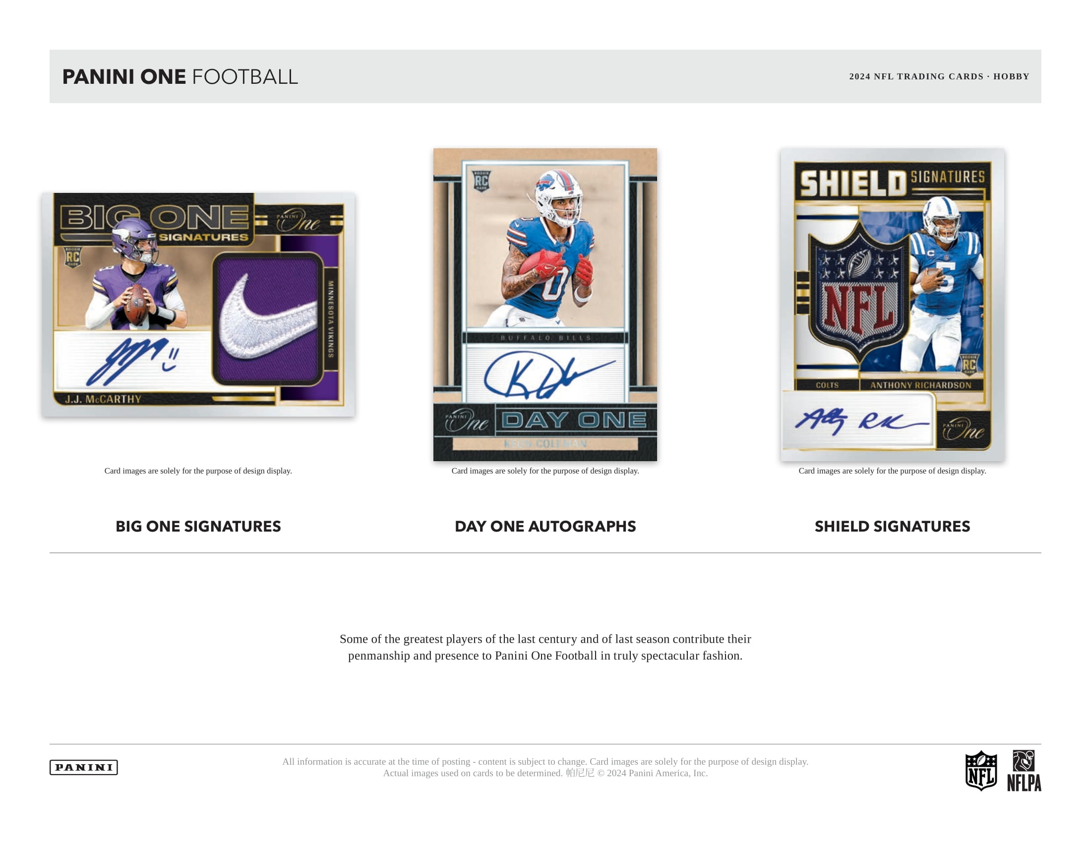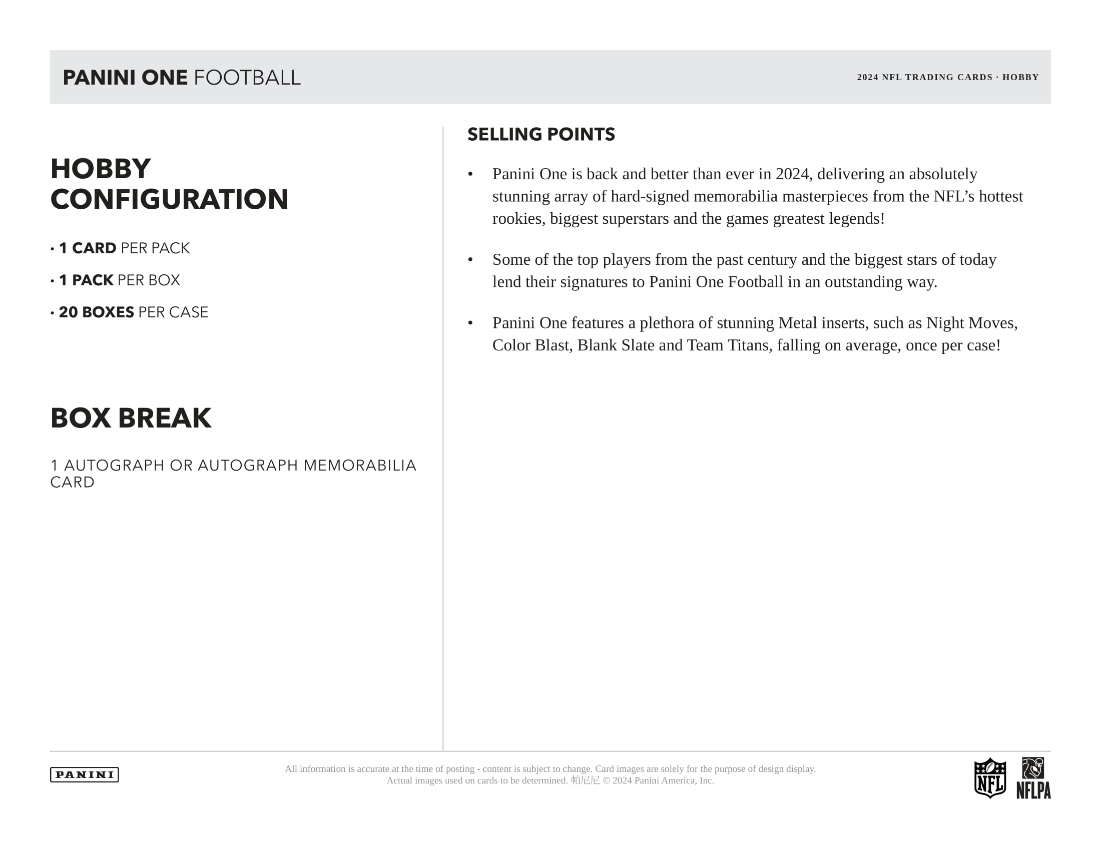 Panini One Football kehrt 2024 zurück - spektakulärer als je zuvor. Diese High-End-Box liefert eine einzige, aber besonders hochwertige Karte: ein On-Card Autogramm, oft kombiniert mit Game-Used Memorabilia - direkt von den größten NFL-Stars, Top-Rookies und Legenden.