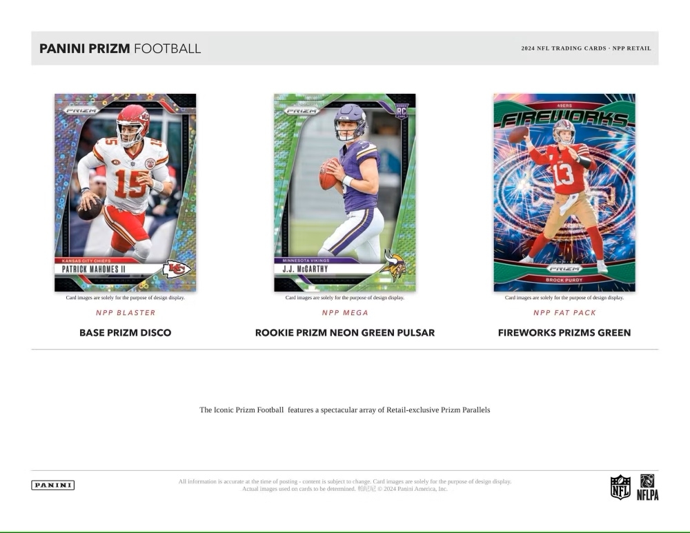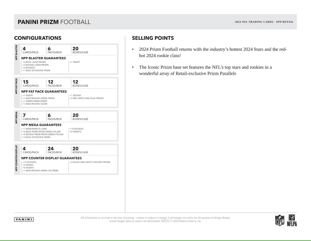 Das 2024 Panini Prizm Football kehrt zurück mit den heißesten 2024-Stars und der brandneuen, vielversprechenden Rookie-Klasse!