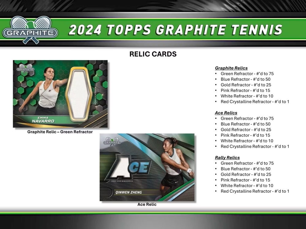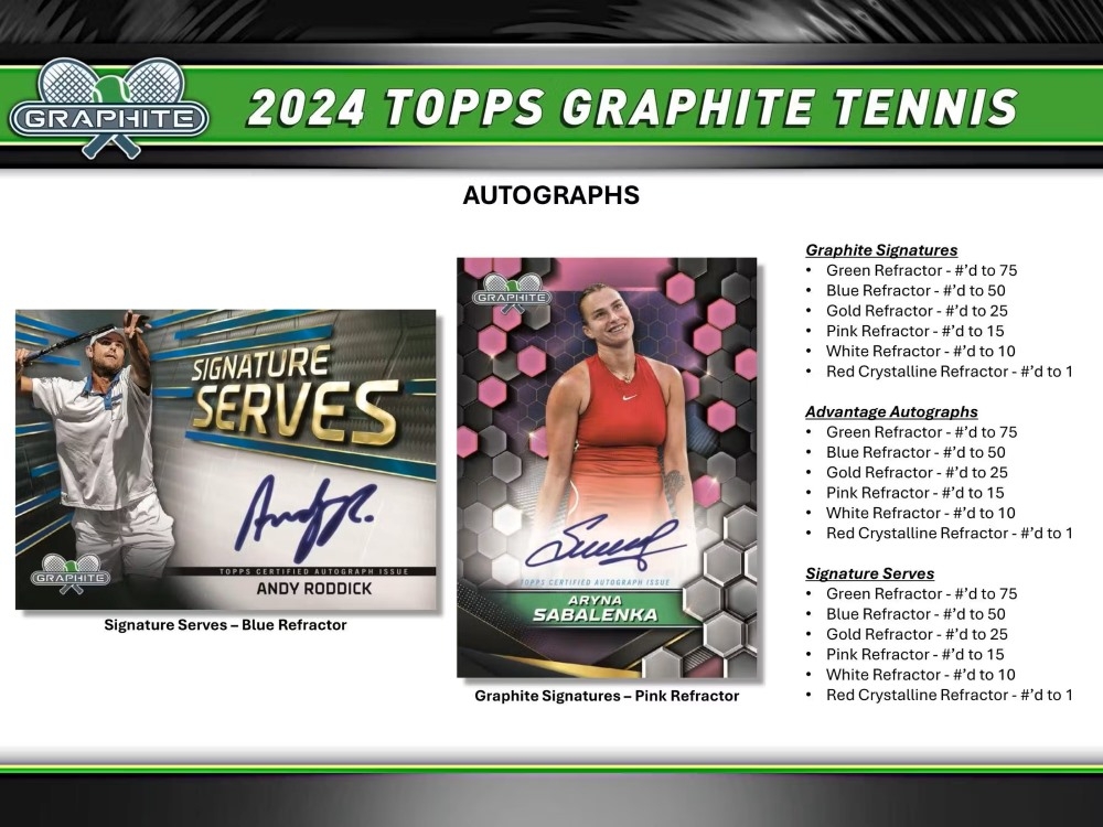 Topps Graphite Tennis feiert sein Hobby-Debüt und bringt eine spannende Mischung aus Relics, Autographs, Autograph Relics und Metal Cards. Gedruckt auf hochwertiger Chrome-Technologie, bietet die Serie beeindruckende Graphite Refractor Parallels, darunter die exklusive Red Crystalline 1/1!
