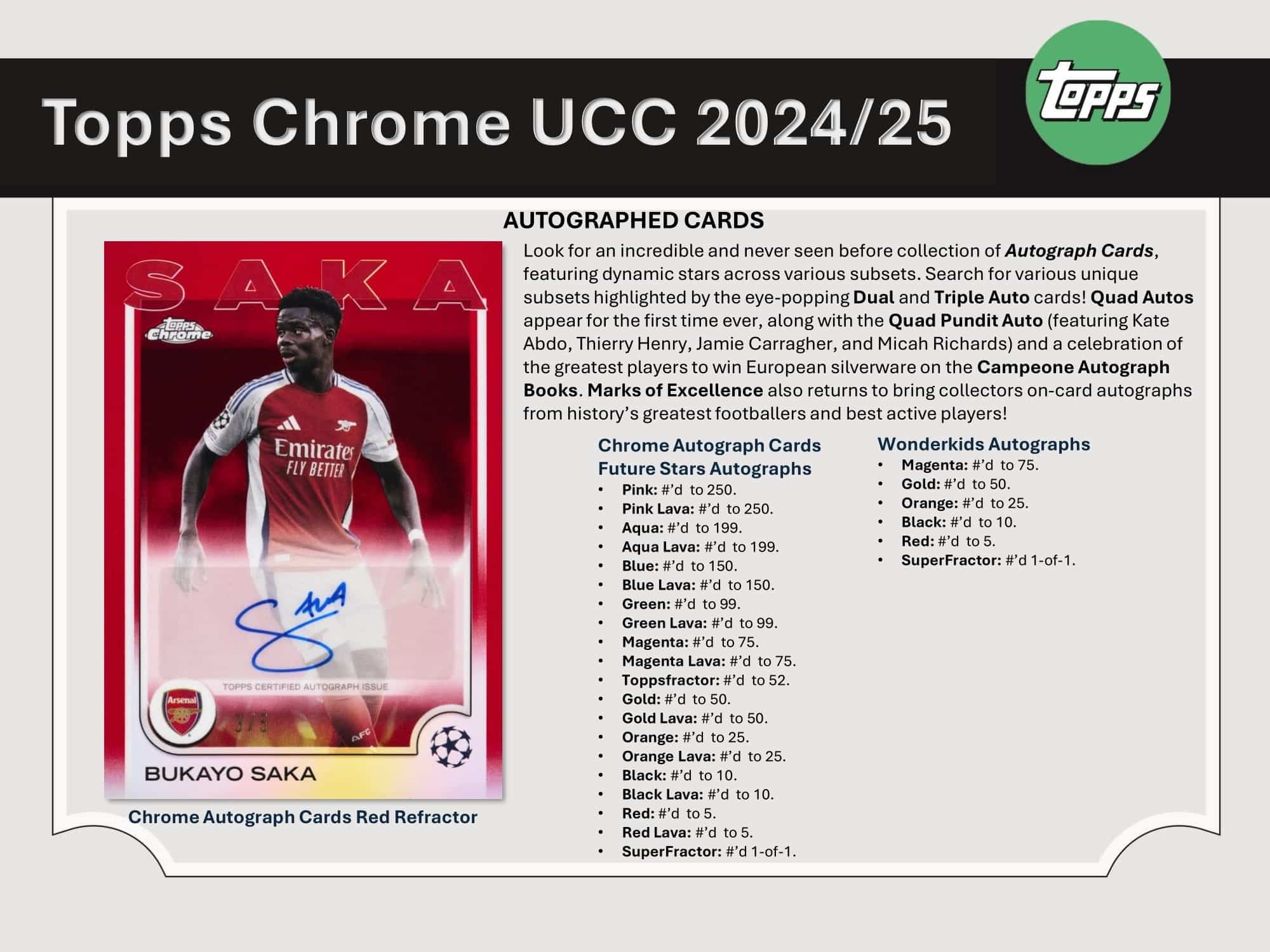 In jeder Box, im Durchschnitt: 1 Autogramme, 6 Refractors, 3 Pulsar Refractors und 3 nummerierte Parallel Sammelkarten !