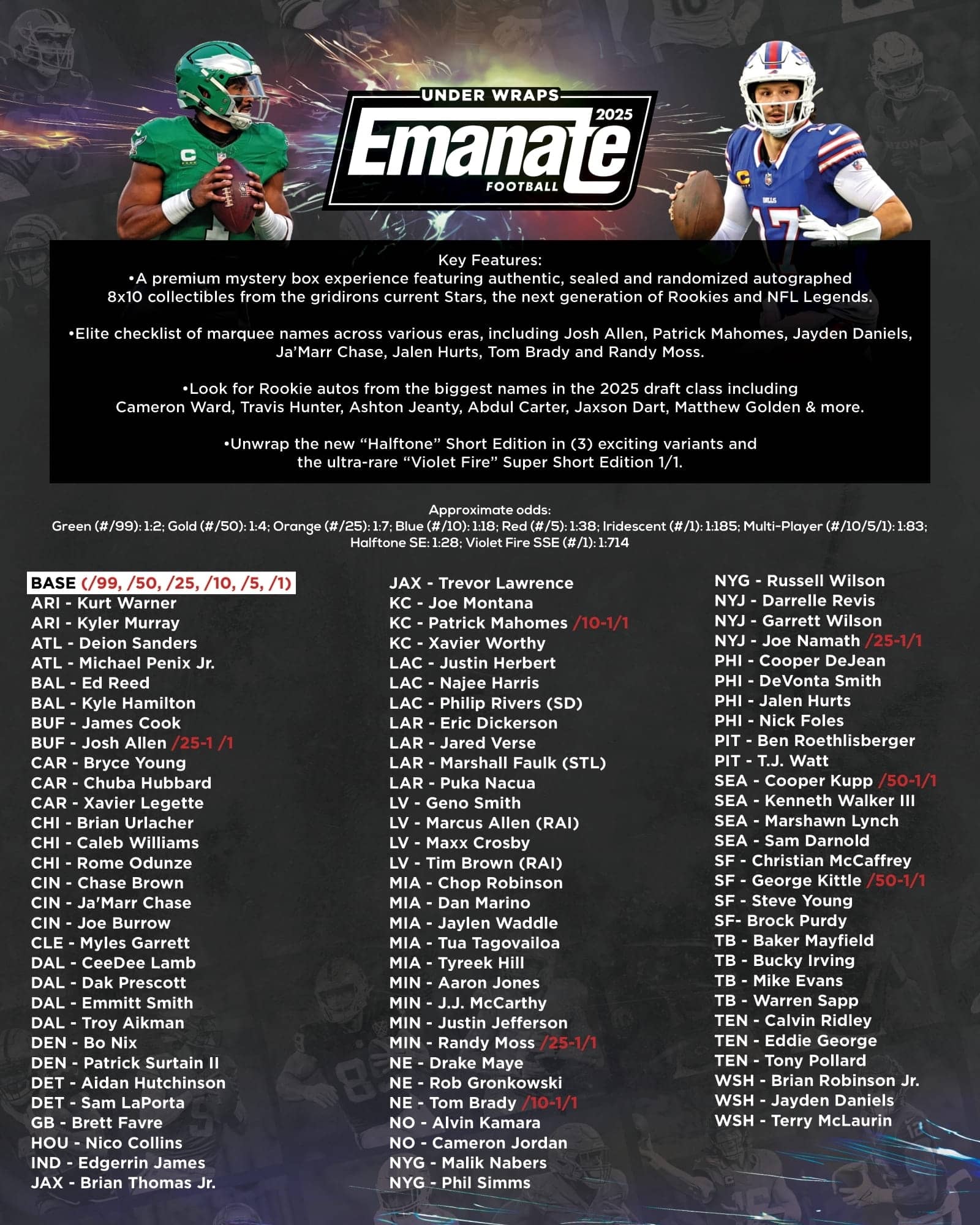 Die beliebte Under Wraps Emanate Serie kehrt 2025 zurück - und bringt euch ein ganz besonderes Sammlererlebnis: In jeder Box findet sich ein original signiertes 8×10 Inch Foto eines aktuellen Superstars oder einer NFL-Legende. Neu designte Verpackung, spannende Editionen und starke Namen machen diese Serie zu einem Highlight für alle NFL-Fans!