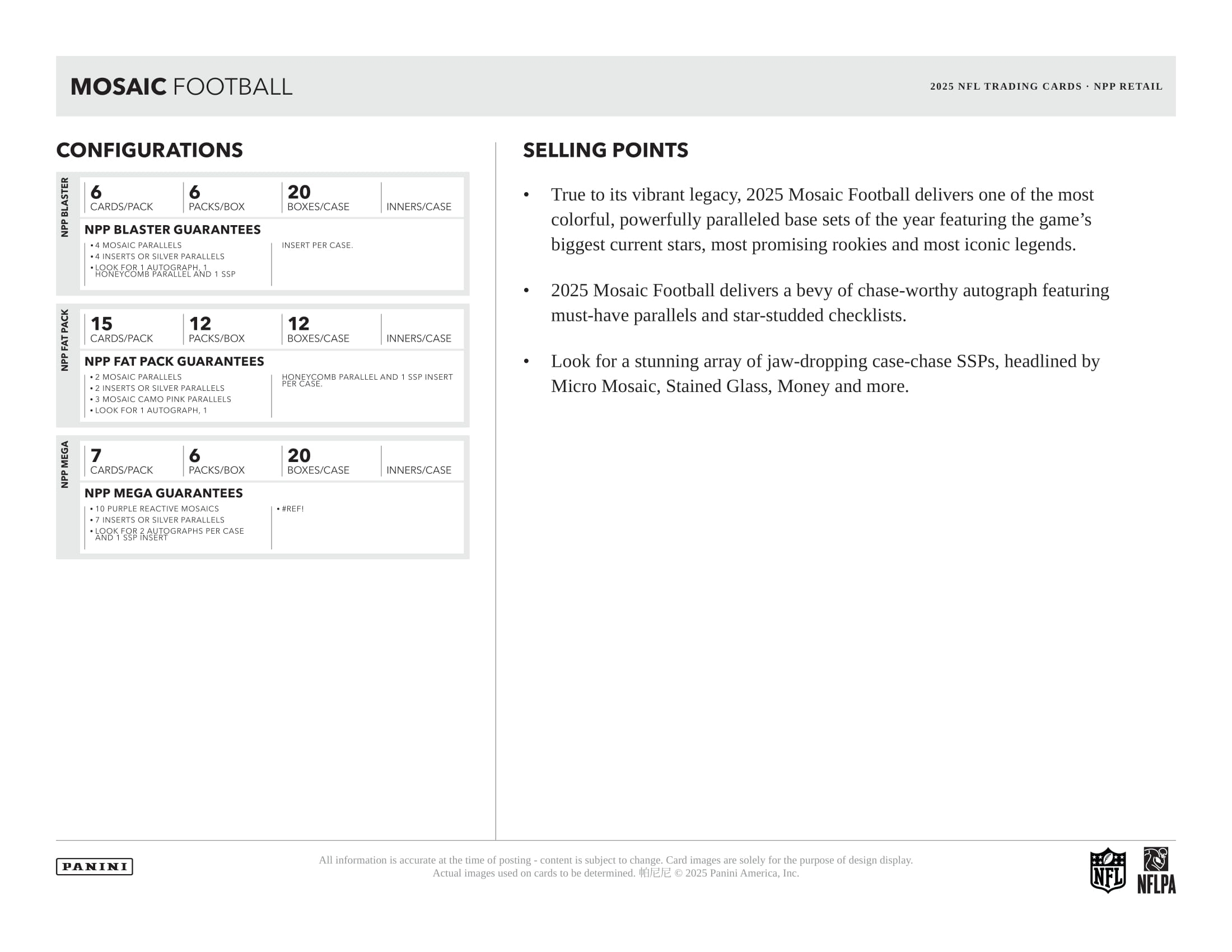 Wie gewohnt liefert Mosaic eine Vielzahl spektakulärer Autogrammkarten mit einer starken Checklist voller NFL-Stars, aufstrebender Talente und legendärer Namen. Zahlreiche Parallels und exklusive Farbvarianten sorgen für zusätzliche Spannung bei jedem Pack.