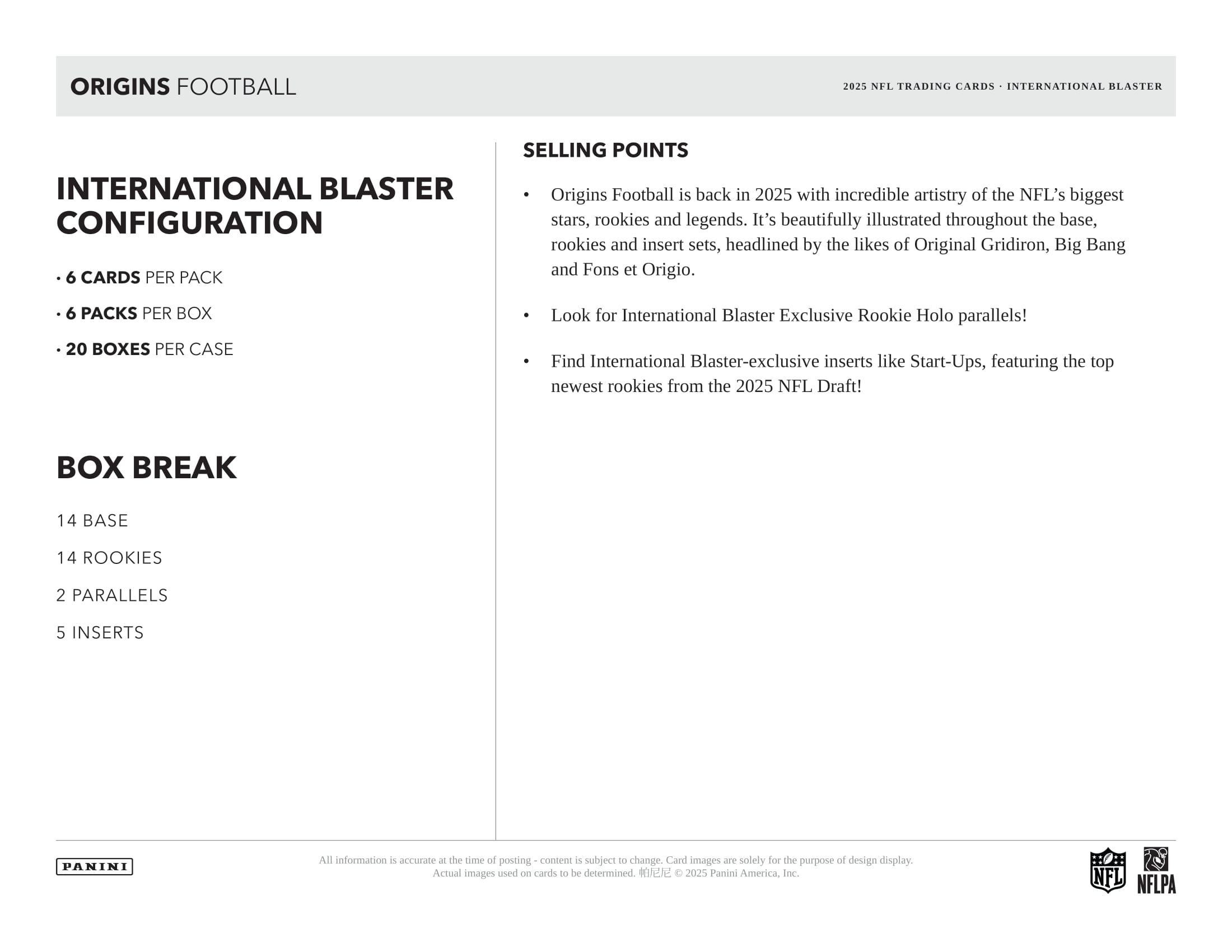 Die beliebte Origins-Serie ist zurück - und bringt auch 2025 wieder die unverwechselbare Verbindung aus kunstvollem Design und NFL-Starpower auf deine Sammelmatte. Die International Blaster Box liefert exklusive Inhalte und ist ideal für alle, die ein hochwertiges NFL-Produkt mit internationalem Flair suchen.