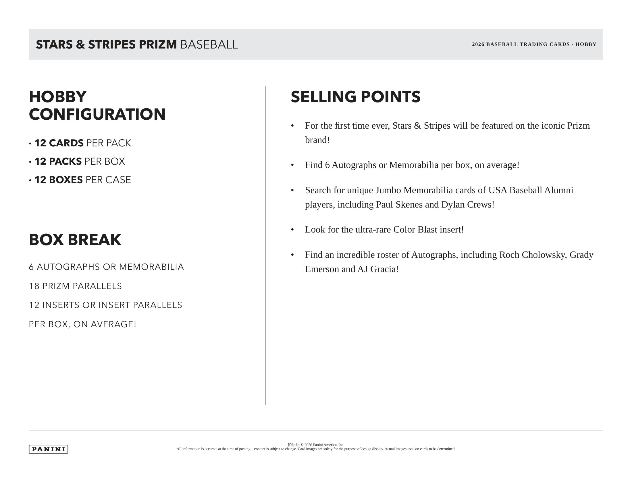 2025 Panini Prizm USA Baseball Stars & Stripes kombiniert die Stärke der Prizm-Technologie mit den besten Talenten des US-Baseballs und bietet eine gelungene Mischung aus Autogrammen, Memorabilia und seltenen Inserts.