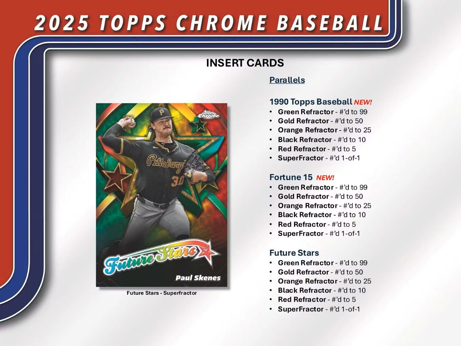 2025 Topps Chrome Baseball bietet alles! Erlebe eine spannende Mischung aus atemberaubenden Inserts und aufregenden Chrom-Parallelen sowie Autogrammkarten einiger der elektrisierendsten Nachwuchstalente der Baseballgeschichte!