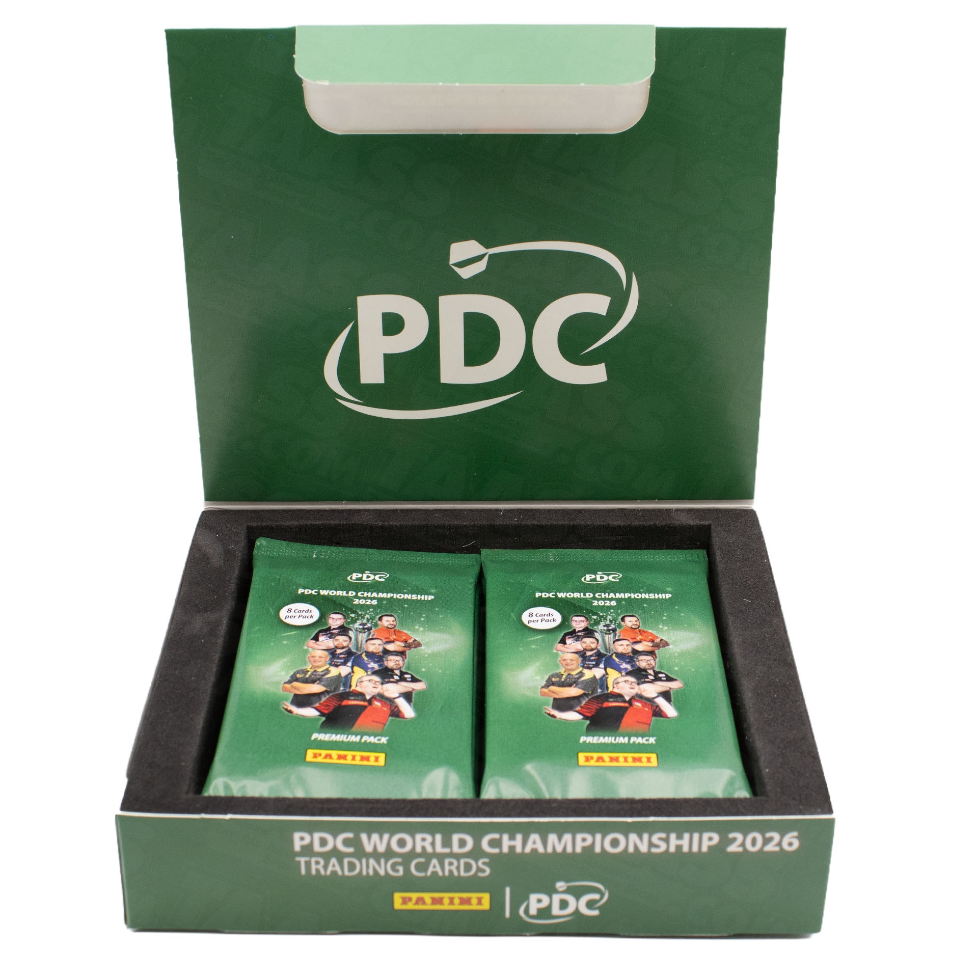 Jede Packung enthält 8 Sammelkarten der PDC-Darts Premium Serie von Panini.