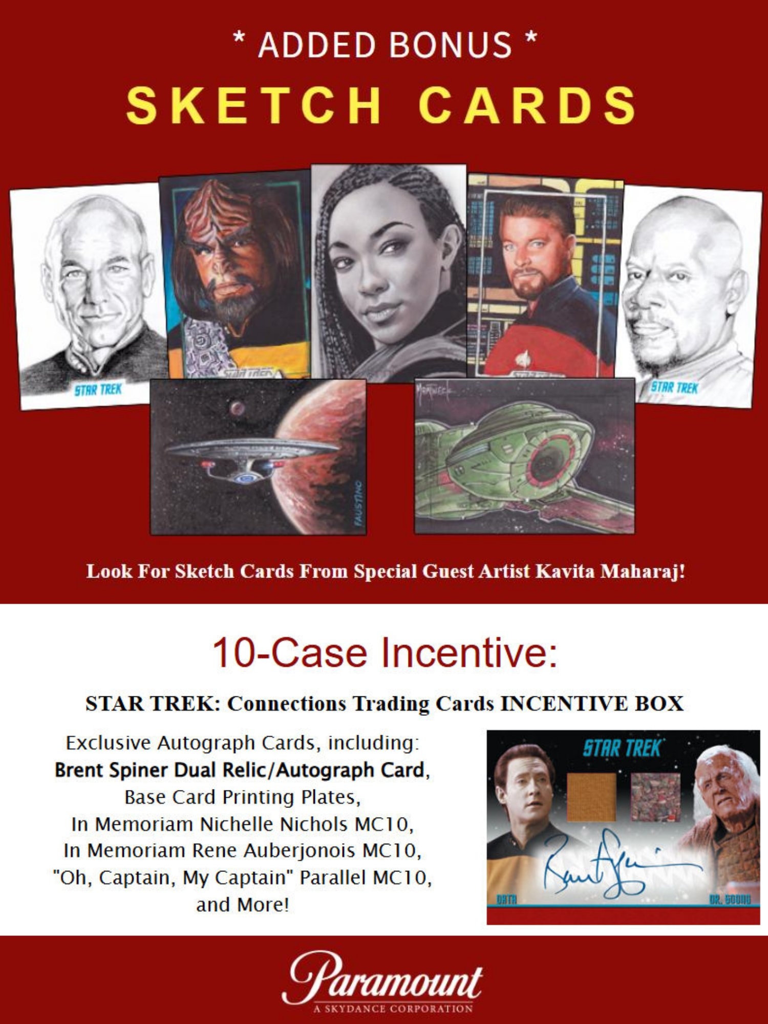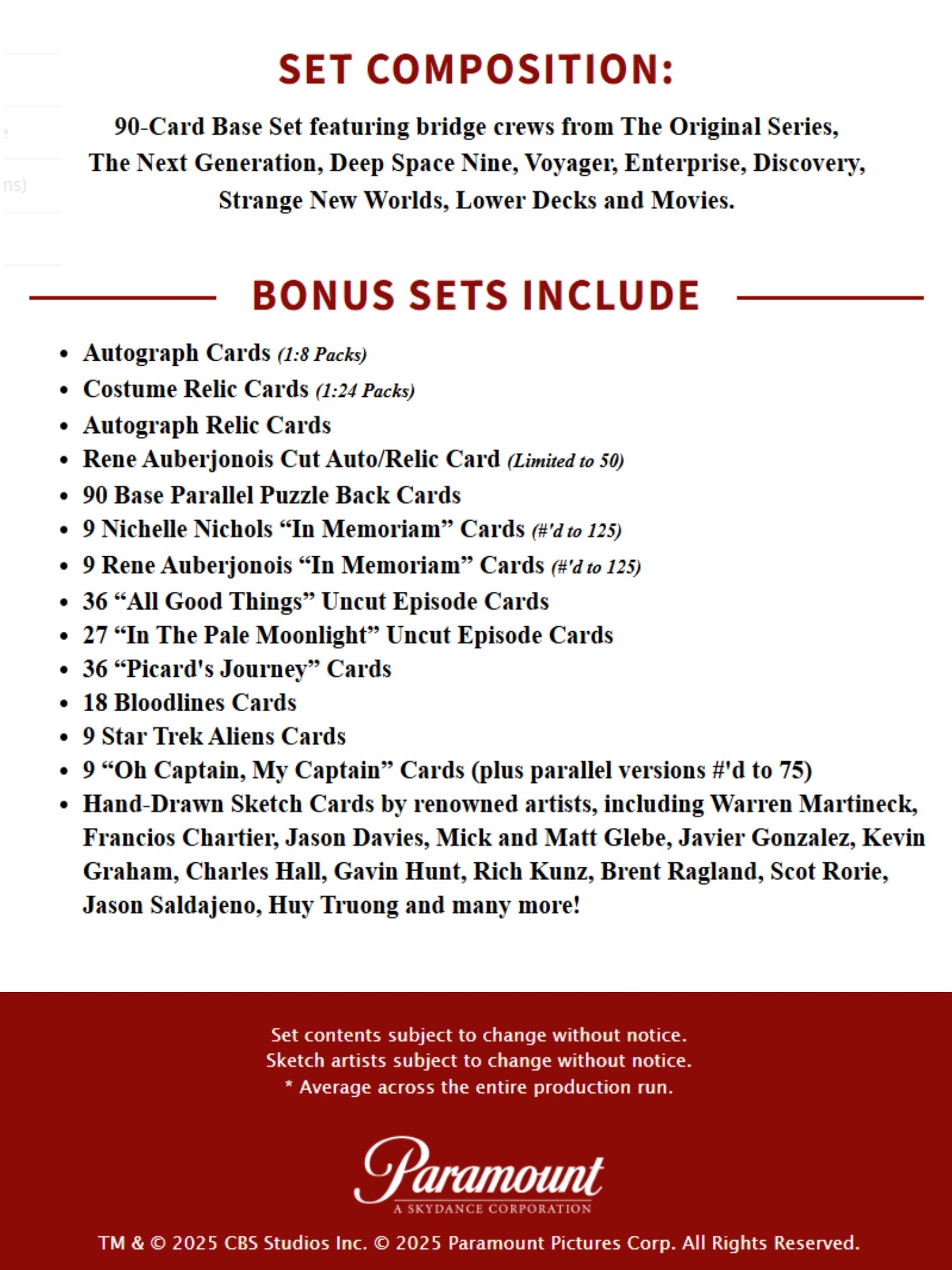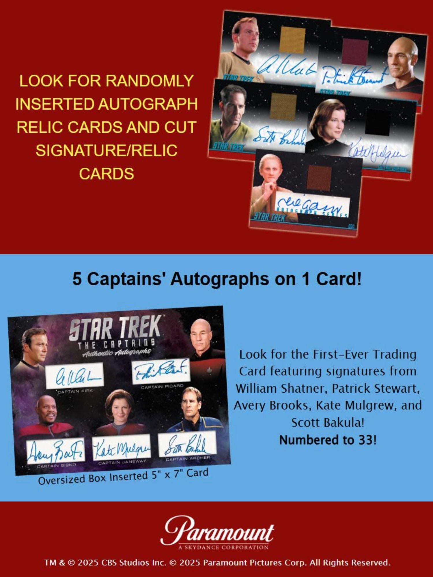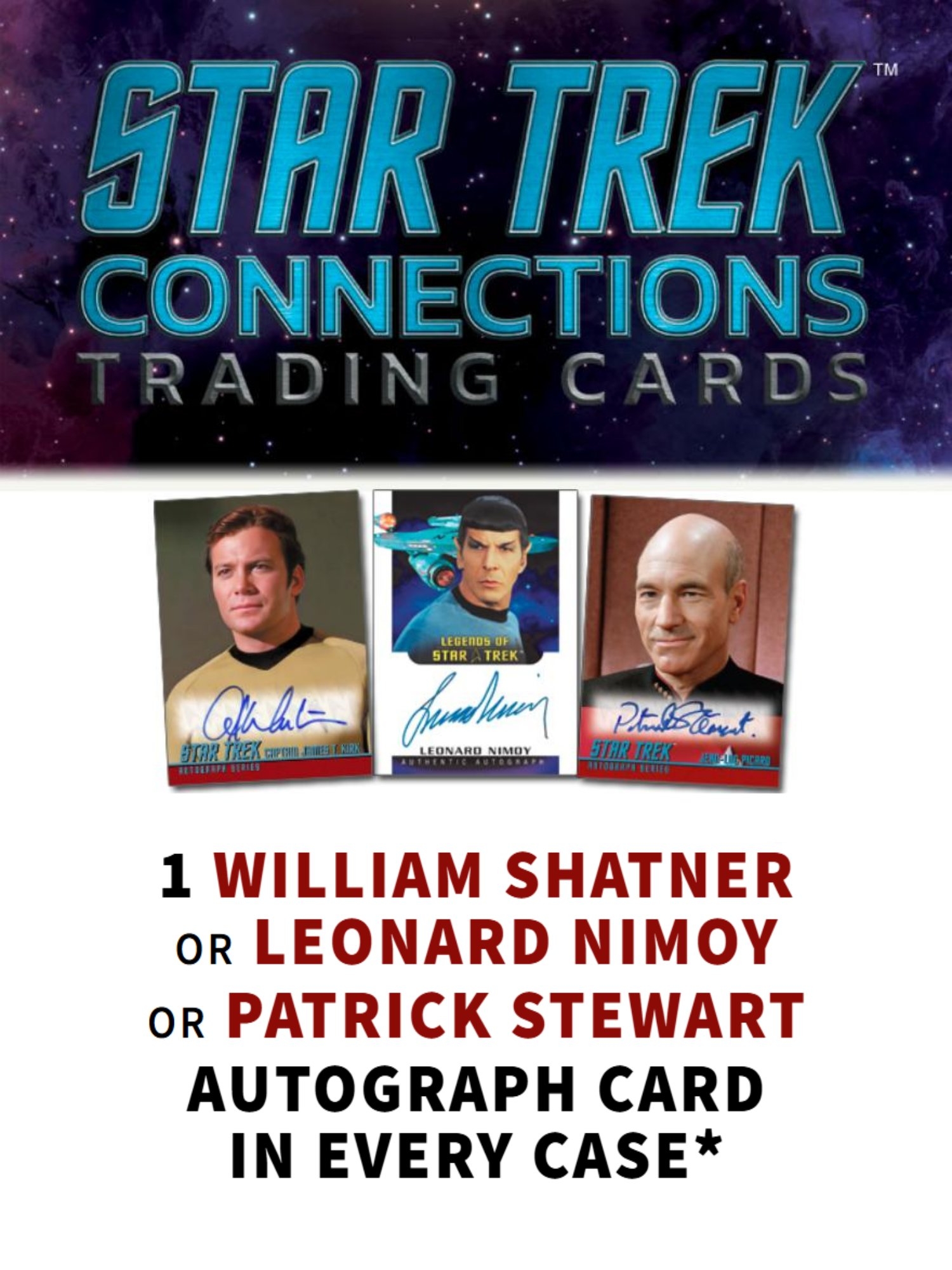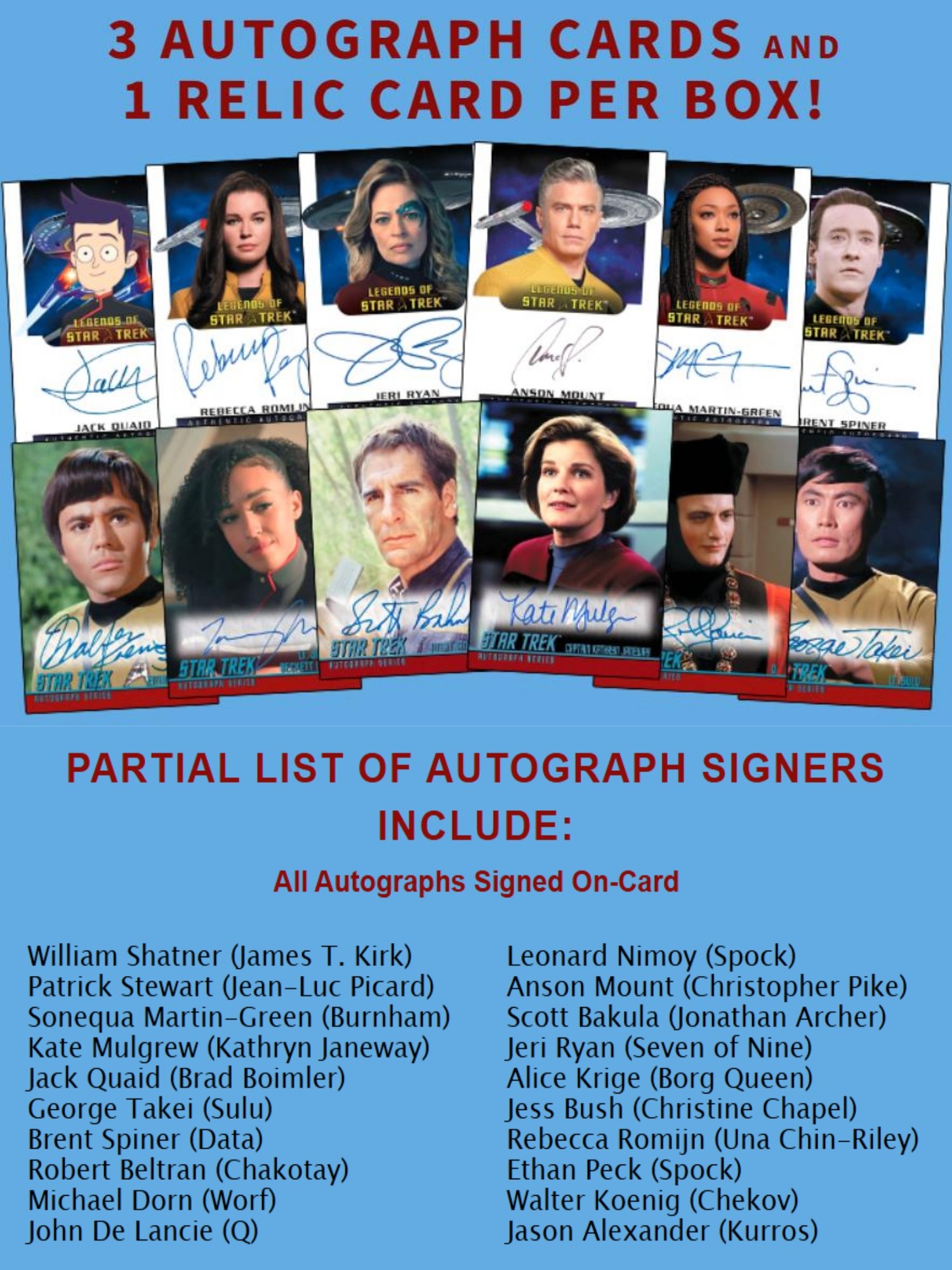 Sammler können sich auf eine außergewöhnliche Auswahl an On-Card Autographs freuen - darunter Legenden wie William Shatner, Patrick Stewart, Leonard Nimoy, Kate Mulgrew, Scott Bakula, Avery Brooks, Brent Spiner, Jeri Ryan, Anson Mount, Rebecca Romijn, Jack Quaid und viele weitere bekannte Stars aus den verschiedenen Serien und Filmen des Star-Trek-Universums.