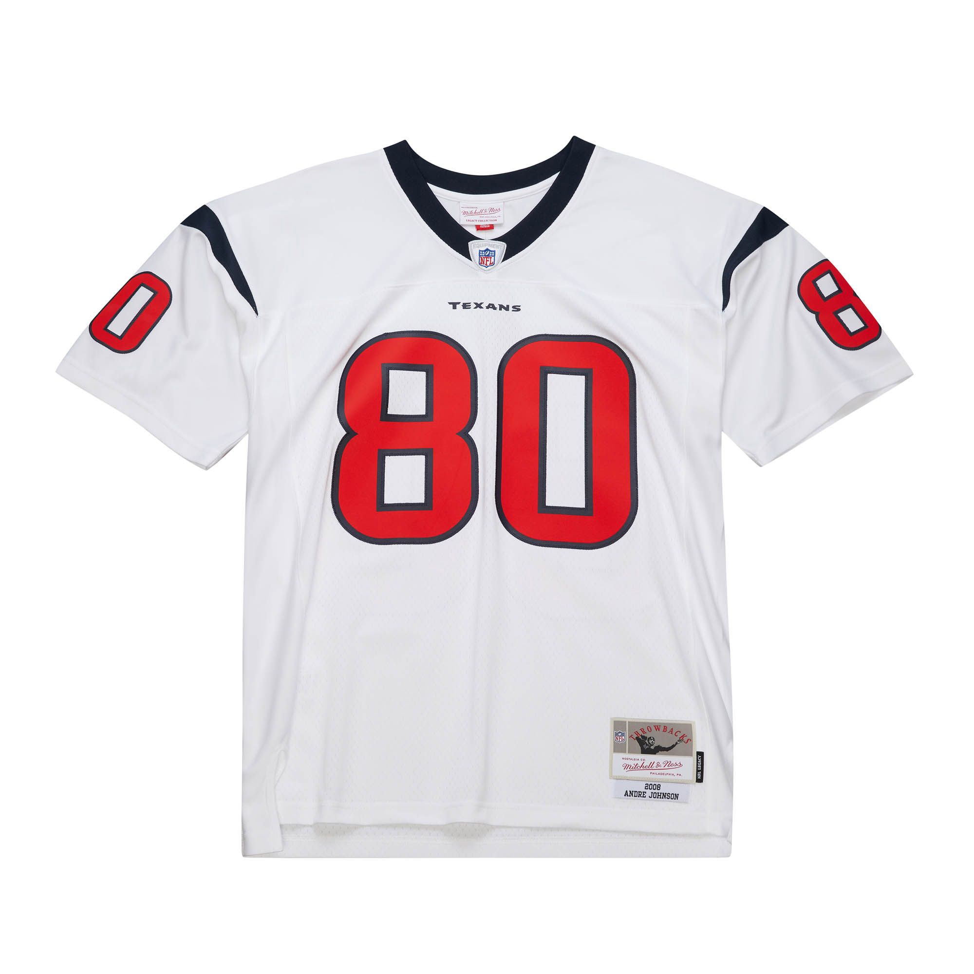 Alle Nummern und Buchstaben sind sorgfältig aufgenäht und spiegeln das offizielle NFL-Design der Houston Texans Trikots von 2008 wider. Das NFL-Shield am Kragen und das Mitchell & Ness Label (Legacy Collection) am Saum unterstreichen die Authentizität dieses Throwback-Stücks.