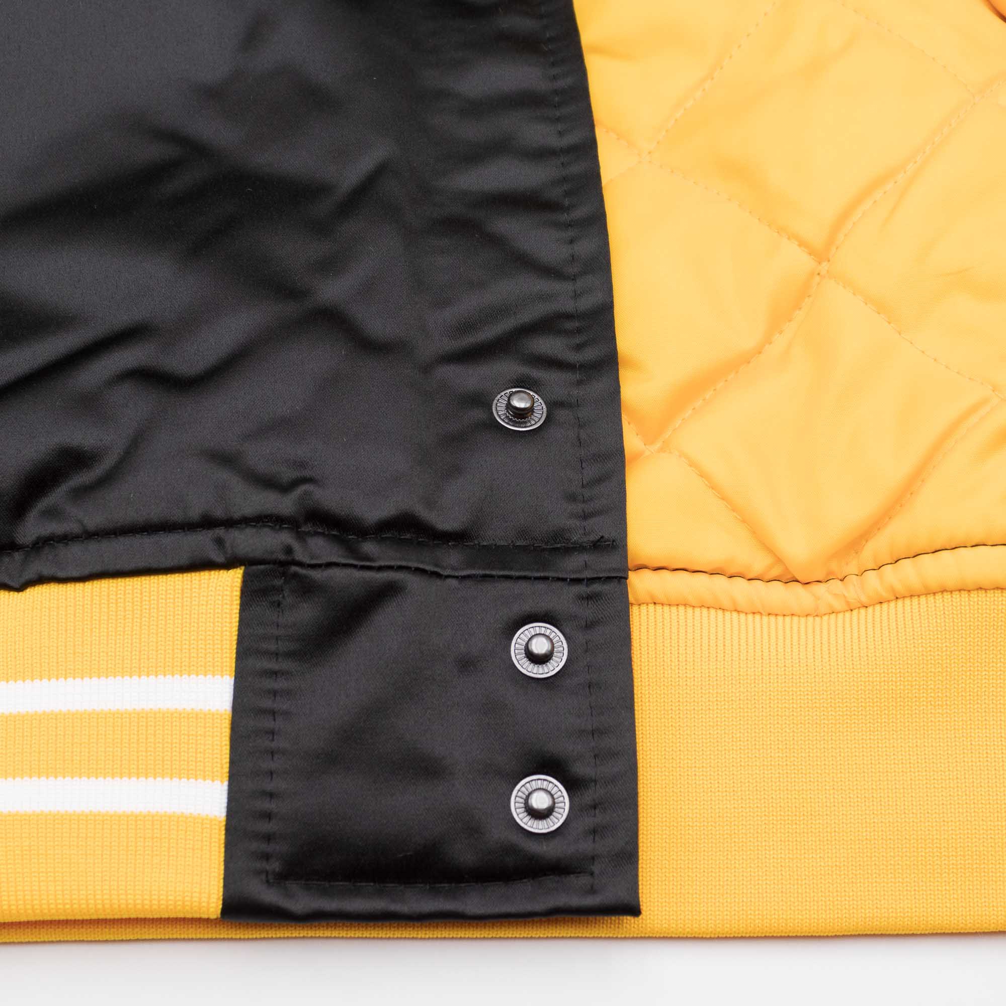Die Mitchell and Ness Premium NHL Jacke mit klassischer Satin-Außenhülle bringt Eishockey-Style zurück in deinen Alltag. Die NHL Jacke hat zwei äußere Taschen, eine Innentasche und eine durchgehende Knopfleiste. Das mittelschwere Futter sorgt auch an kalten Tagen für eine angenehme Wärmeisolierung, die elastischen Strickbünde am Kragen, am Bund und an den Ärmelenden sorgen für den absoluten Retro-Look. Das Design ist den amerikanischen College und High School Jacken nachempfunden und macht mit dem glänzenden Satin-Look modisch richtig was her. Der Mitchell & Ness Schriftzug ist am rechten Ärmelsaum aufgestickt. Die Boston Bruins Teamlogos sind sowohl auf der Vorder- als auch auf der Rückseite hochwertig aufgenäht.