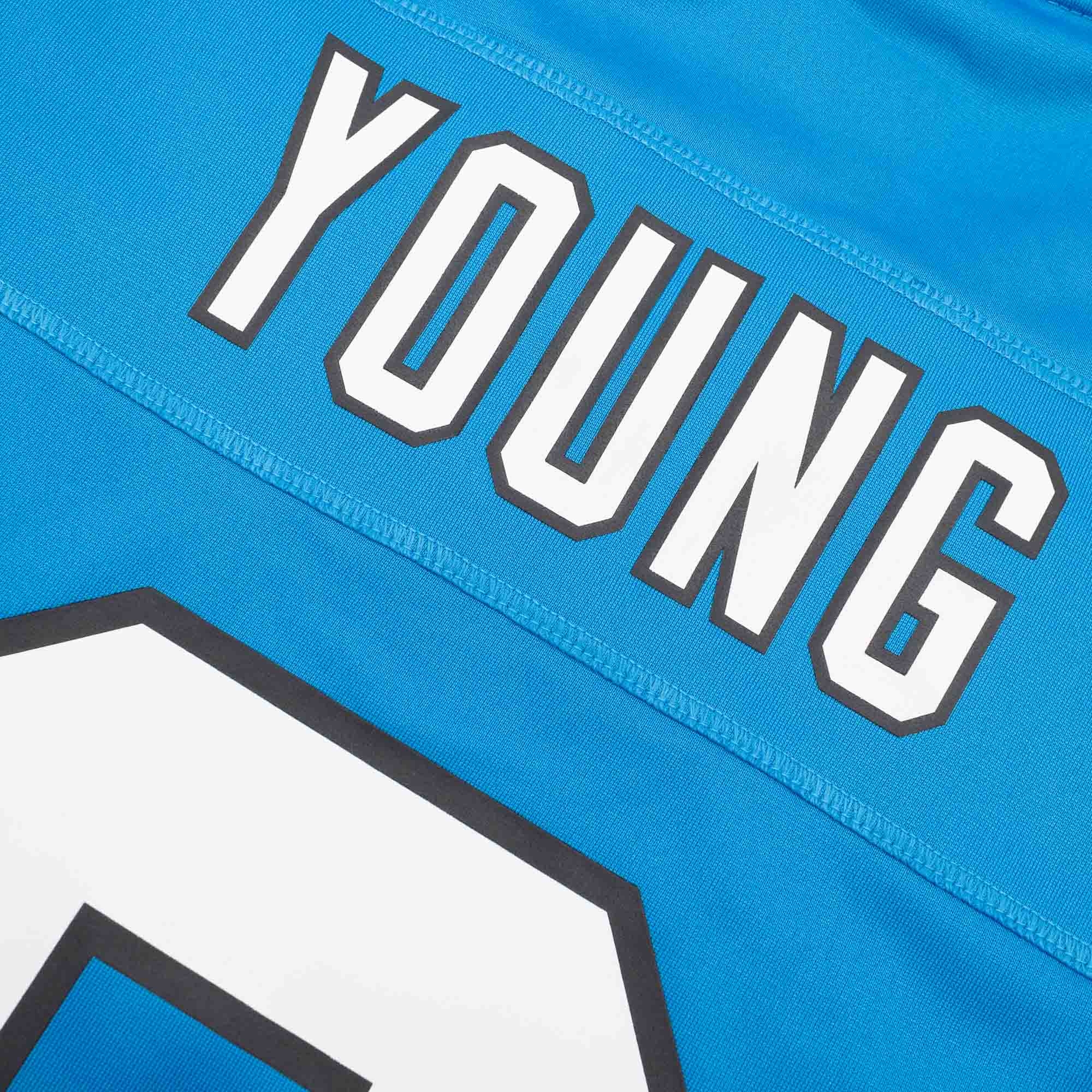 Die Game NFL Trikots sind in hochwertiger Nike-Qualität produziert und sind ein absolutes Must-Have für jeden passionierten American Football Fan. Dieses Carolina Panthers NFL Fan-Trikot besteht zu 100% aus Performance Polyester mit recycelten Fasern aus der Nike Move to Zero Kollektion. Alle Logos, Ziffern und Buchstaben sind hochwertig aufgedruckt (Screen-Printed) und entsprechen dem offiziellen Design der original NFL-Spieltrikots. Das Trikot hat die Nummer 9 und den Spielernamen YOUNG aufgedruckt, das Nameplate ist sogar extra aufgenäht. Das NFL-Shield am Kragen ist genauso wie das Equipment-Label am Saum aufgenäht.