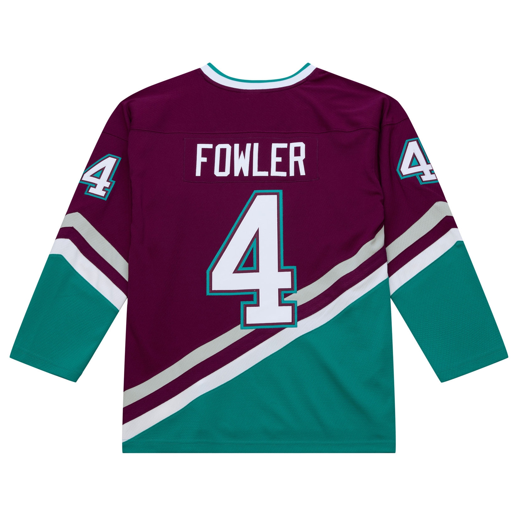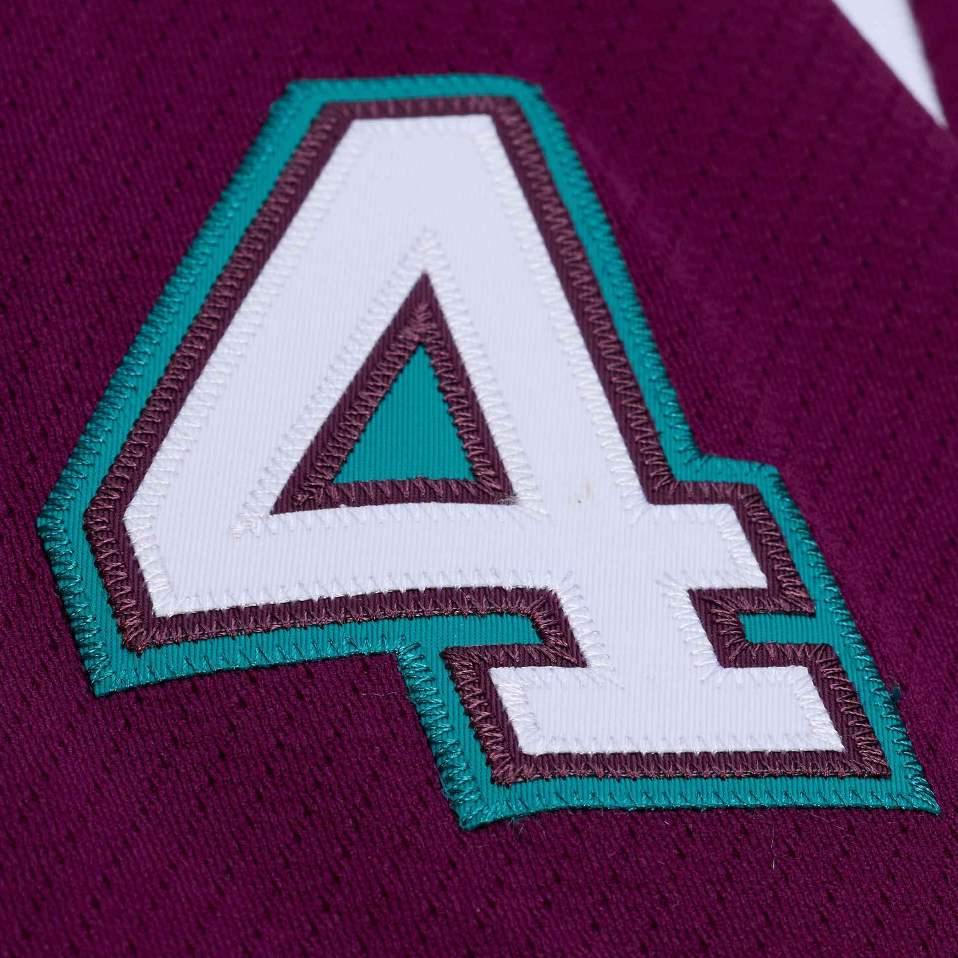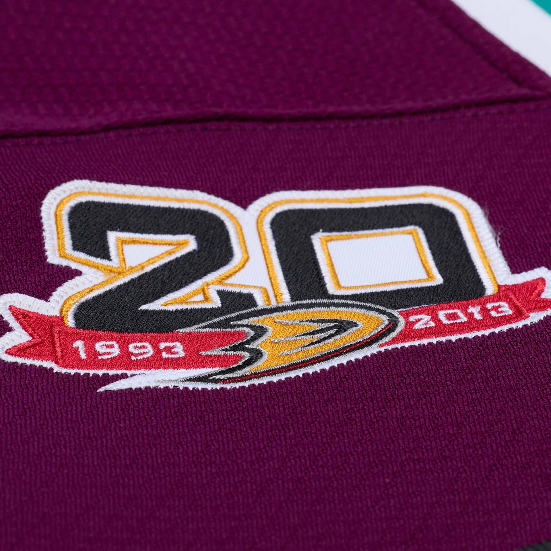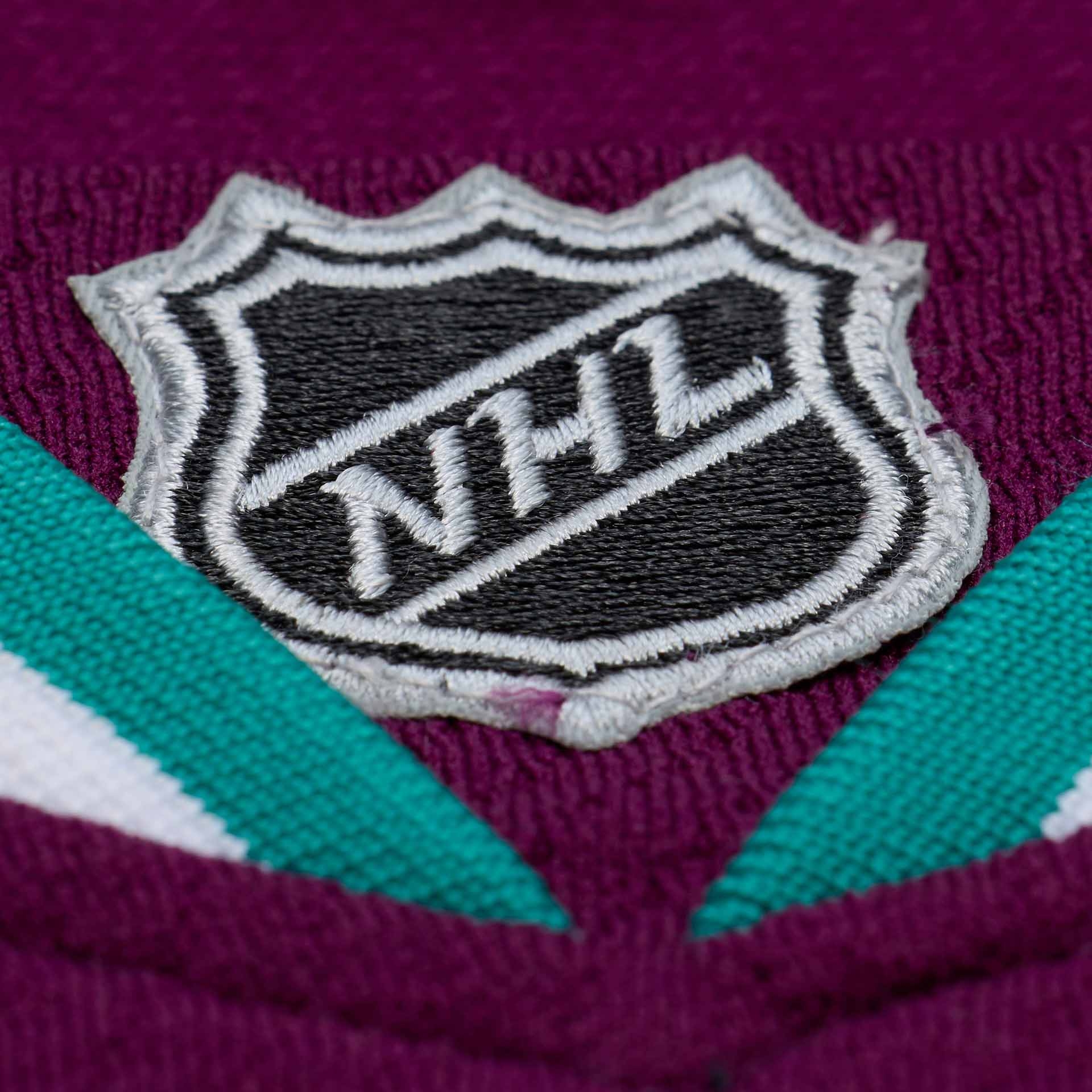 - Vintage Ducks Design: Offizieller Retro-Look der Anaheim Ducks in Plum und Teal mit markantem Diagonalstreifen und großem, vollgesticktem Mighty Ducks Logo auf der Brust.