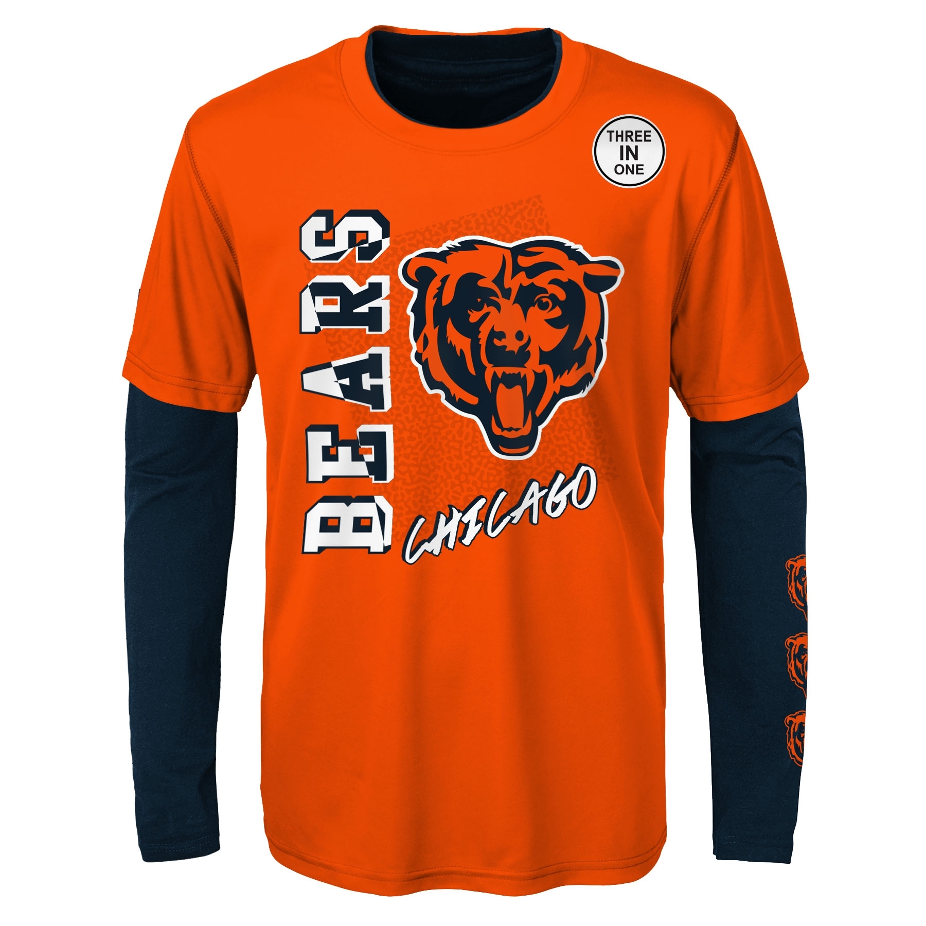 Outerstuff NFL Youth 3-in-1 Combo Shirt Set für Kinder und Jugendliche von den Chicago Bears. Das Set besteht aus einem T-Shirt und einem Long Sleeve.
