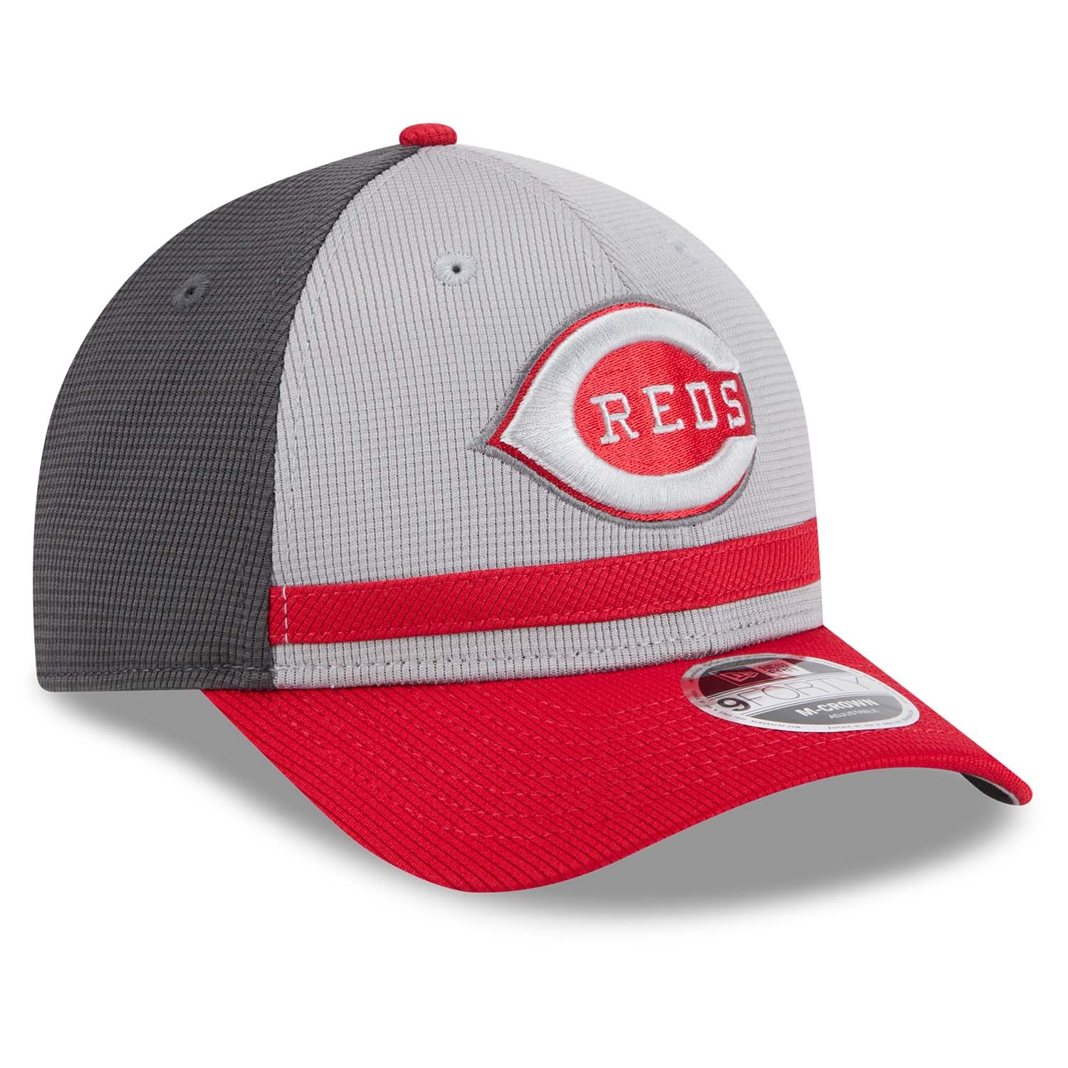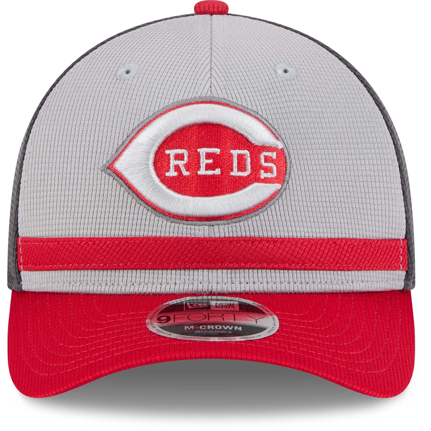 New Era Baseball Adjustable Snapback Cap im 9FORTY M-Crown Style von deinen Cincinnati Reds aus der grauen Colorway 2025 MLB Batting Practice Kollektion.