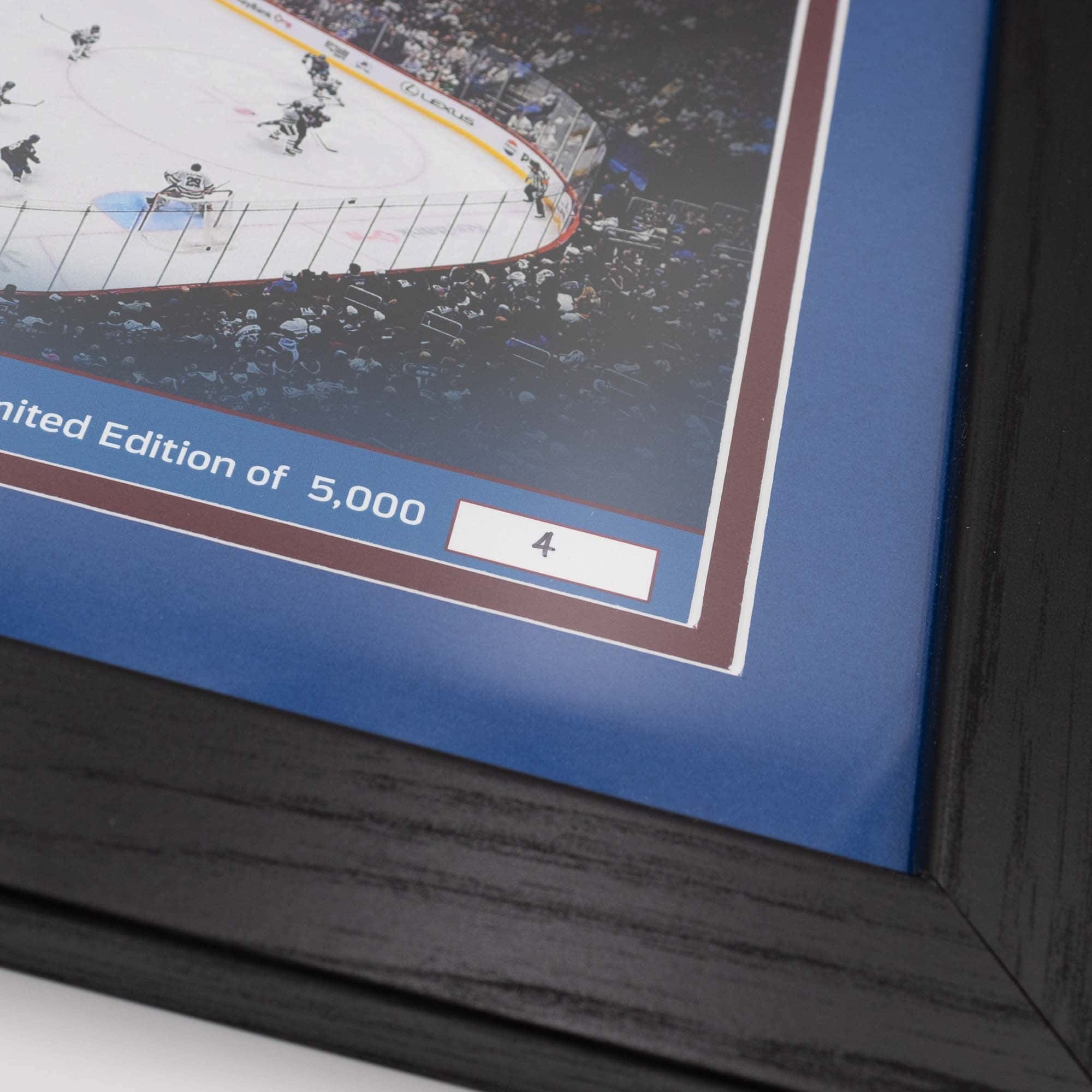 Dieses 33 cm x 40 cm Kunstwerk mit doppelter Mattierung unter einer Glasfrontplatte zeigt ein individuell nummeriertes Foto von deinen Colorado Avalanche! Das kunstvoll arrangierte Bild zeigt das Colorado Avalanche Teamlogo vor dem Hintergrund der Eishockey Arena. Zusätzlich wird dieses einmalige Sammlerstück mit einer geprägten 39 mm Team Bronze-Gedenkmünze hervorgehoben. Alle Stanley Cup Championships sind ebenfalls aufgeführt.