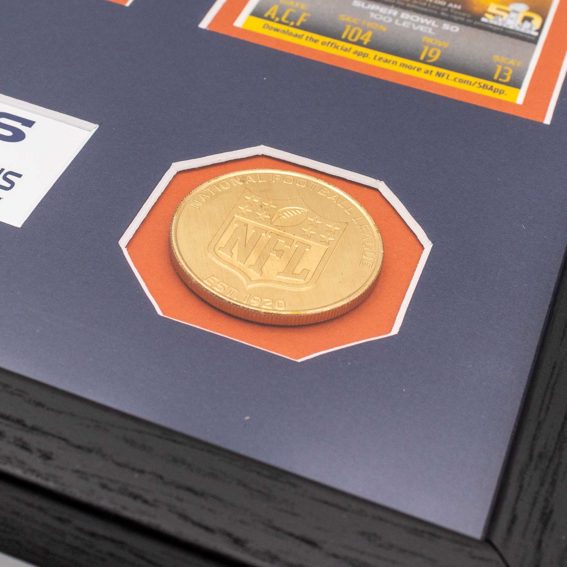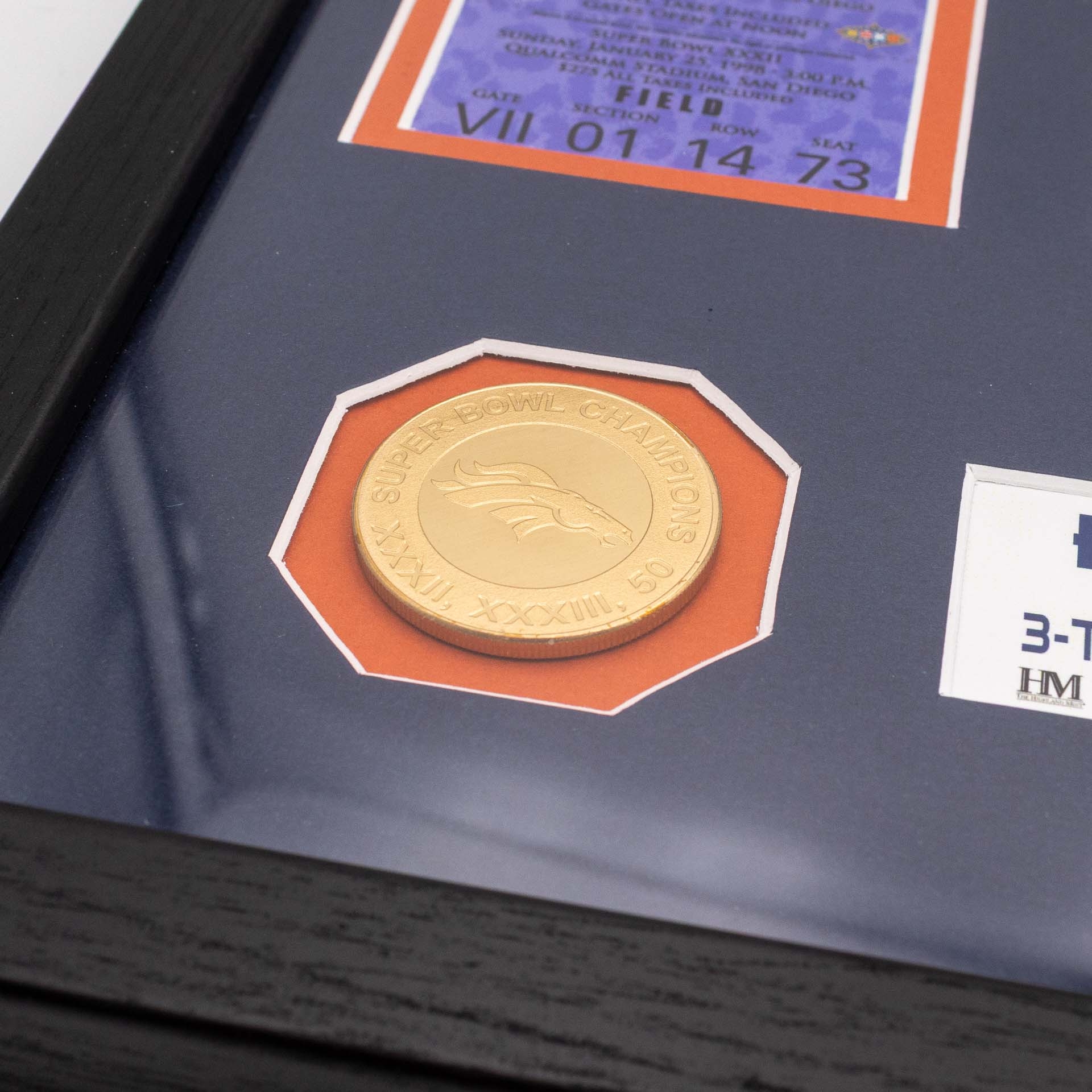 Highland Mint NFL gerahmtes Bild mit zwei Bronzemünzen und den Super Bowl Champions Tickets der Denver Broncos.