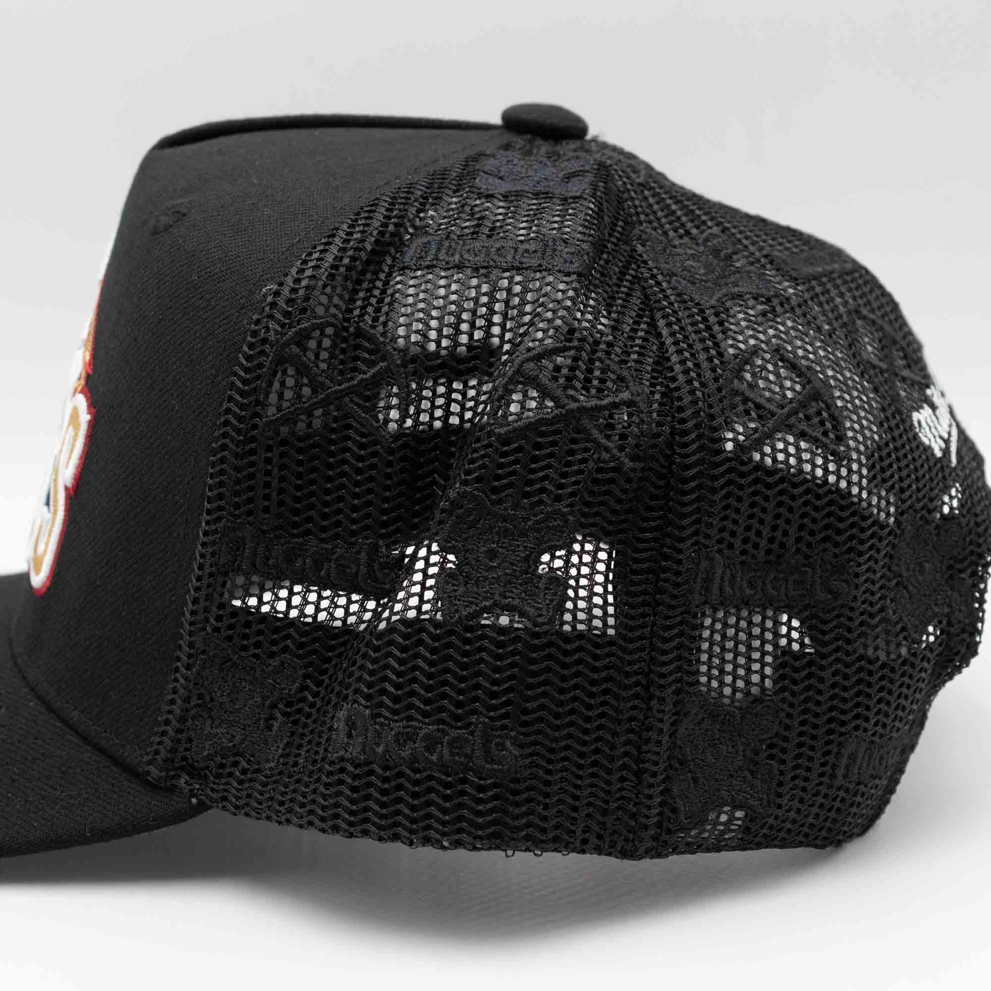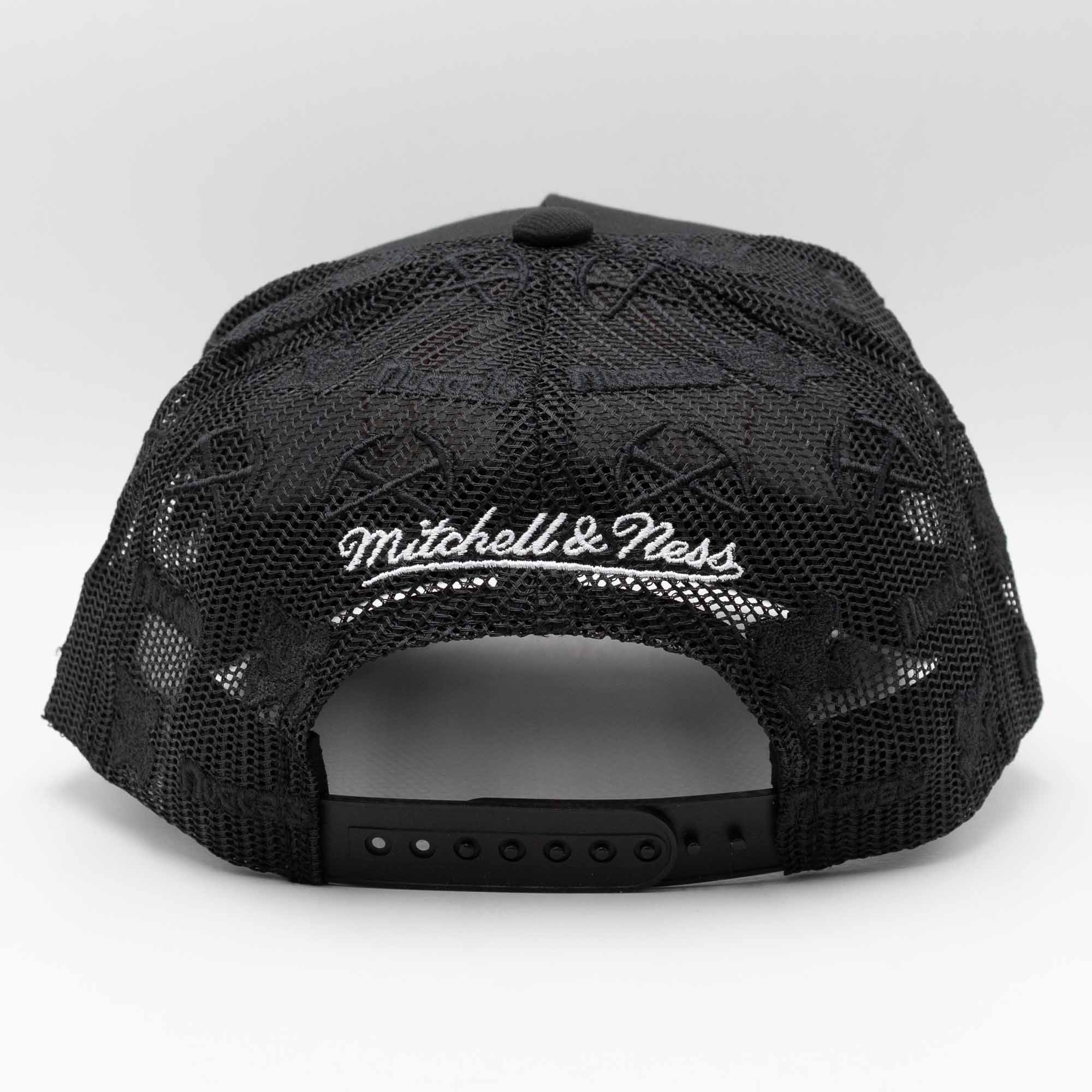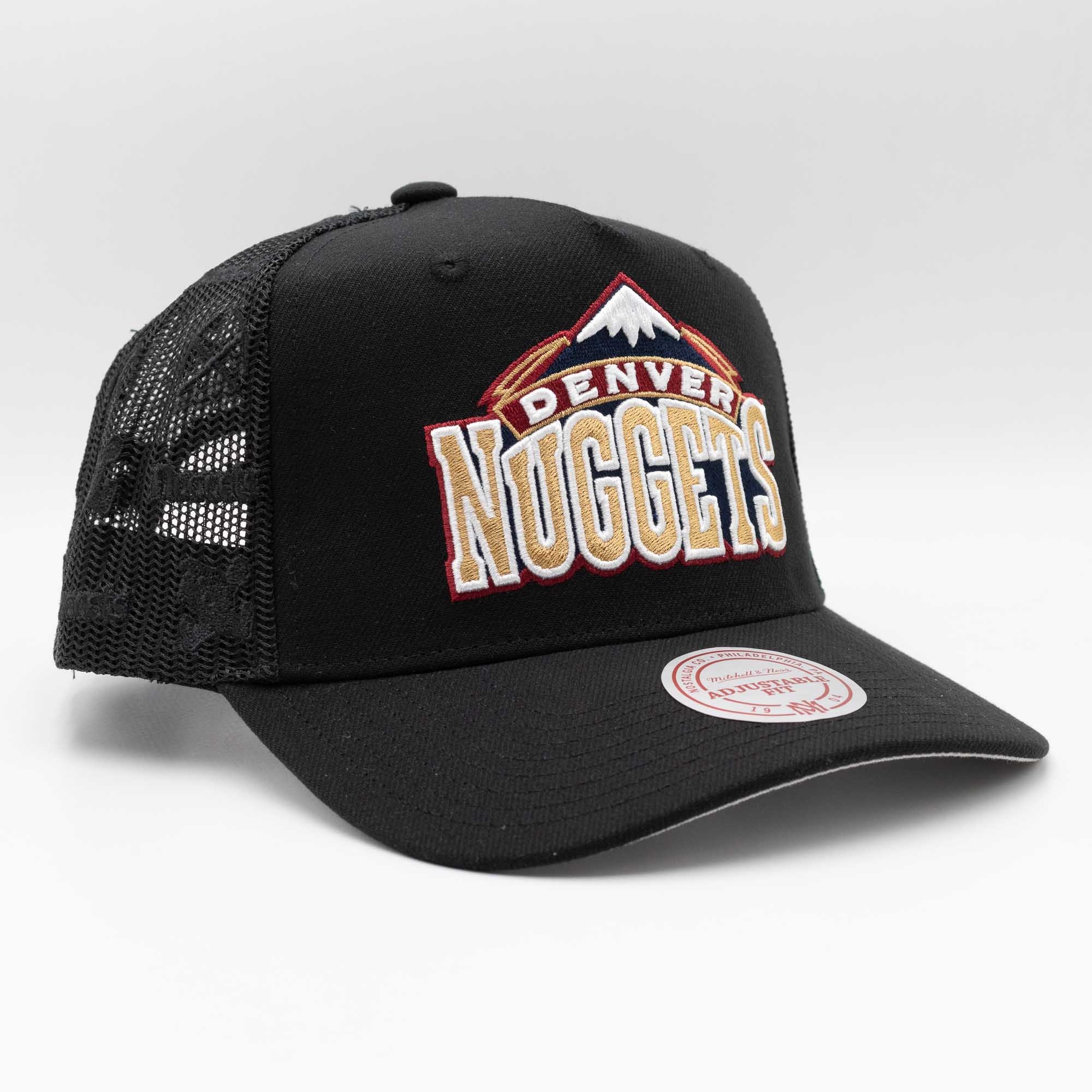 Mitchell & Ness NBA Adjustable Fit Trucker Cap von deinen Denver Nuggets im schwarzen Monogram Style.