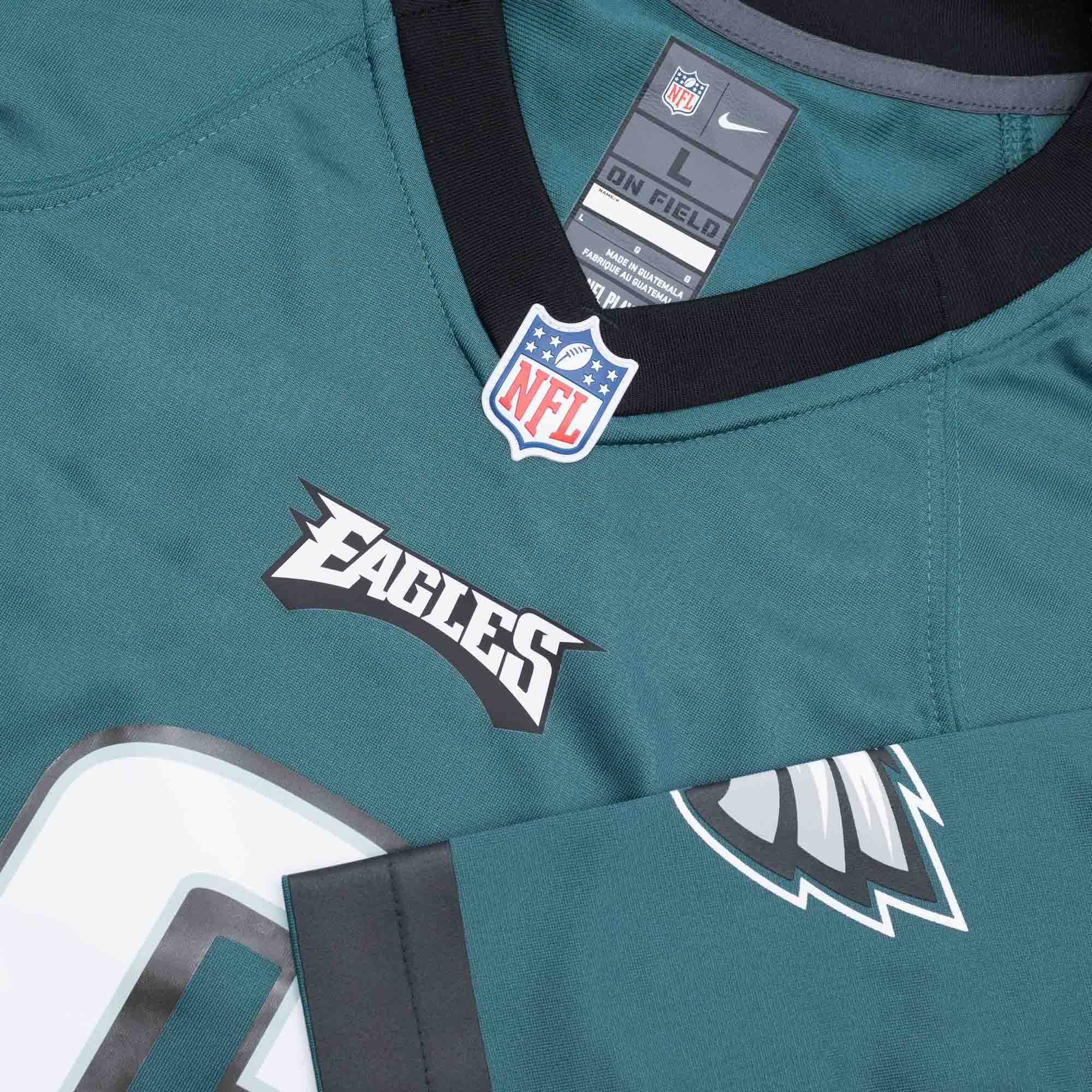 Die Game NFL Trikots sind in hochwertiger Nike-Qualität produziert und sind ein absolutes Must-Have für jeden passionierten American Football Fan. Dieses Philadelphia Eagles NFL Fan-Trikot besteht zu 100% aus recyceltem Polyester. Alle Logos, Ziffern und Buchstaben sind hochwertig aufgedruckt (Screen-Printed) und entsprechen dem offiziellen Design der original NFL-Spieltrikots. Das Trikot hat die Nummer 6 und den Spielernamen SMITH aufgedruckt, das Nameplate ist sogar extra aufgenäht. Das NFL-Shield am Kragen ist genauso wie das Equipment-Label am Saum aufgenäht. Zusätzlich sind die Ärmel mit dem ikonischen Philadelphia Eagles Teamlogos bedruckt. Der Nackenbereich ohne störendes Etikett sorgt für optimierten Tragekomfort. Egal ob am Spieltag oder im Alltag - Mit deinem DeVonta Smith Philadelphia Eagles Trikot zeigst Du ganz klar welches Team Du unterstützt: Fly Eagles Fly!