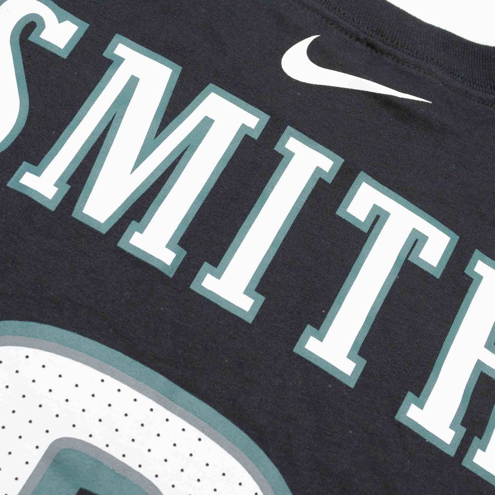 Offiziell lizensiertes Nike Cotton NFL Player Tee mit aufgedruckten Logos und Schriftzügen im originalen Trikotdesign. Auf der Vorderseite sind das Philadelphia Eagles Teamlogo und die Spielernummer 6 aufgedruckt. Die Rückseite ist mit dem Nike Swoosh Logo, dem Spielernamen (SMITH) und der Spielernummer (6) bedruckt.