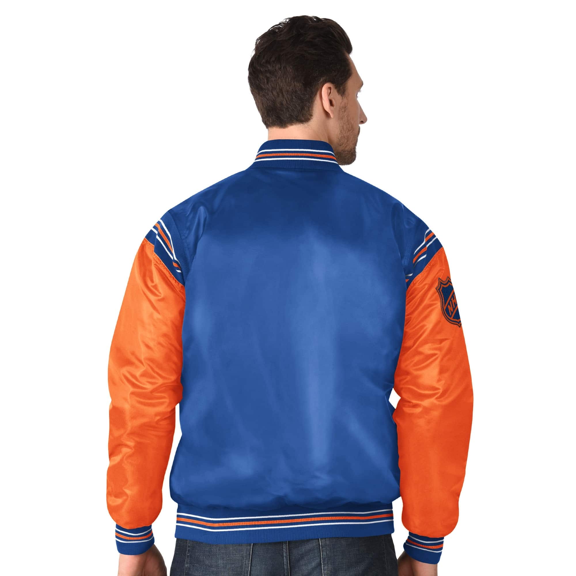 Starter NHL Herren Varsity Satin Jacke im zweifarbigen Enforcer Style deiner Edmonton Oilers.