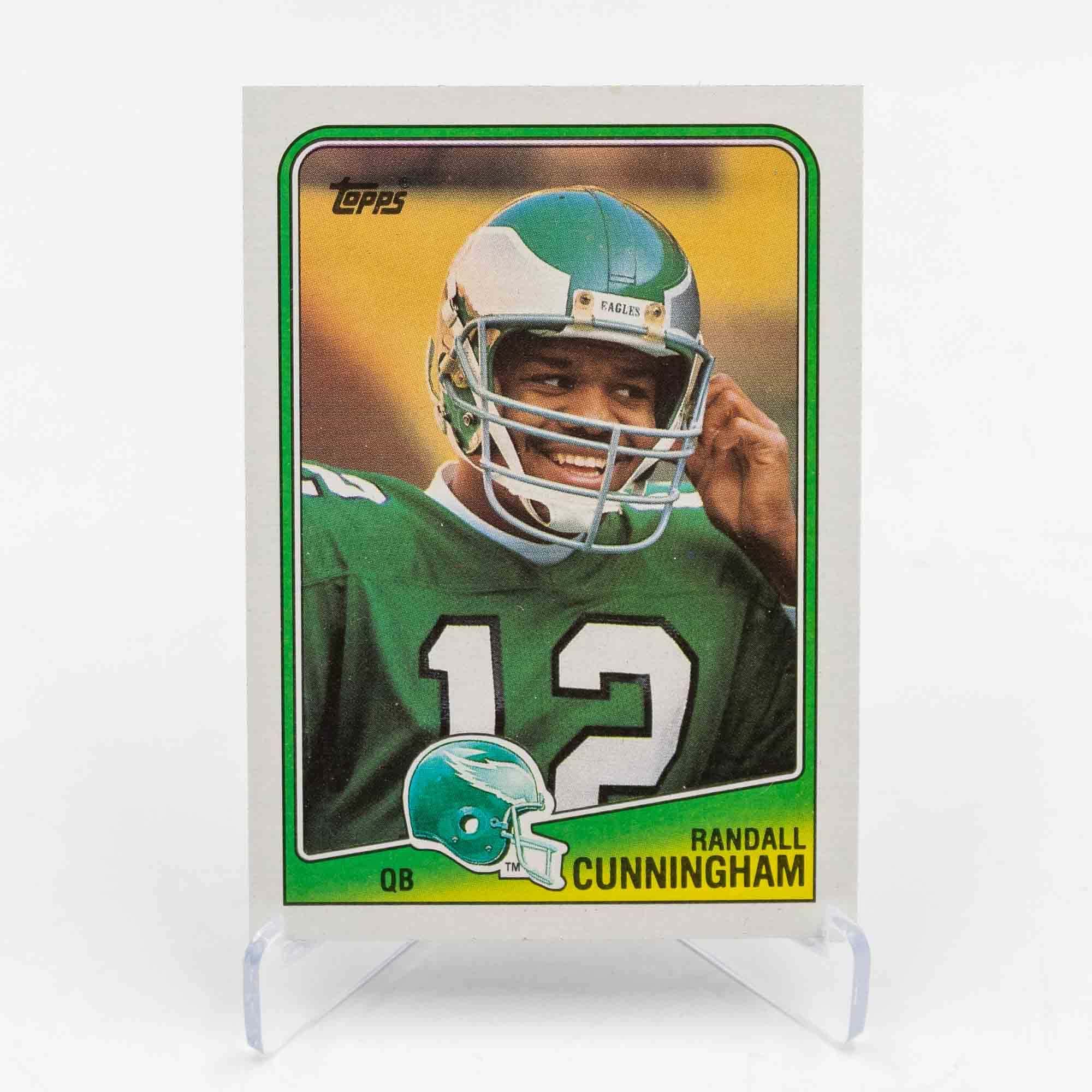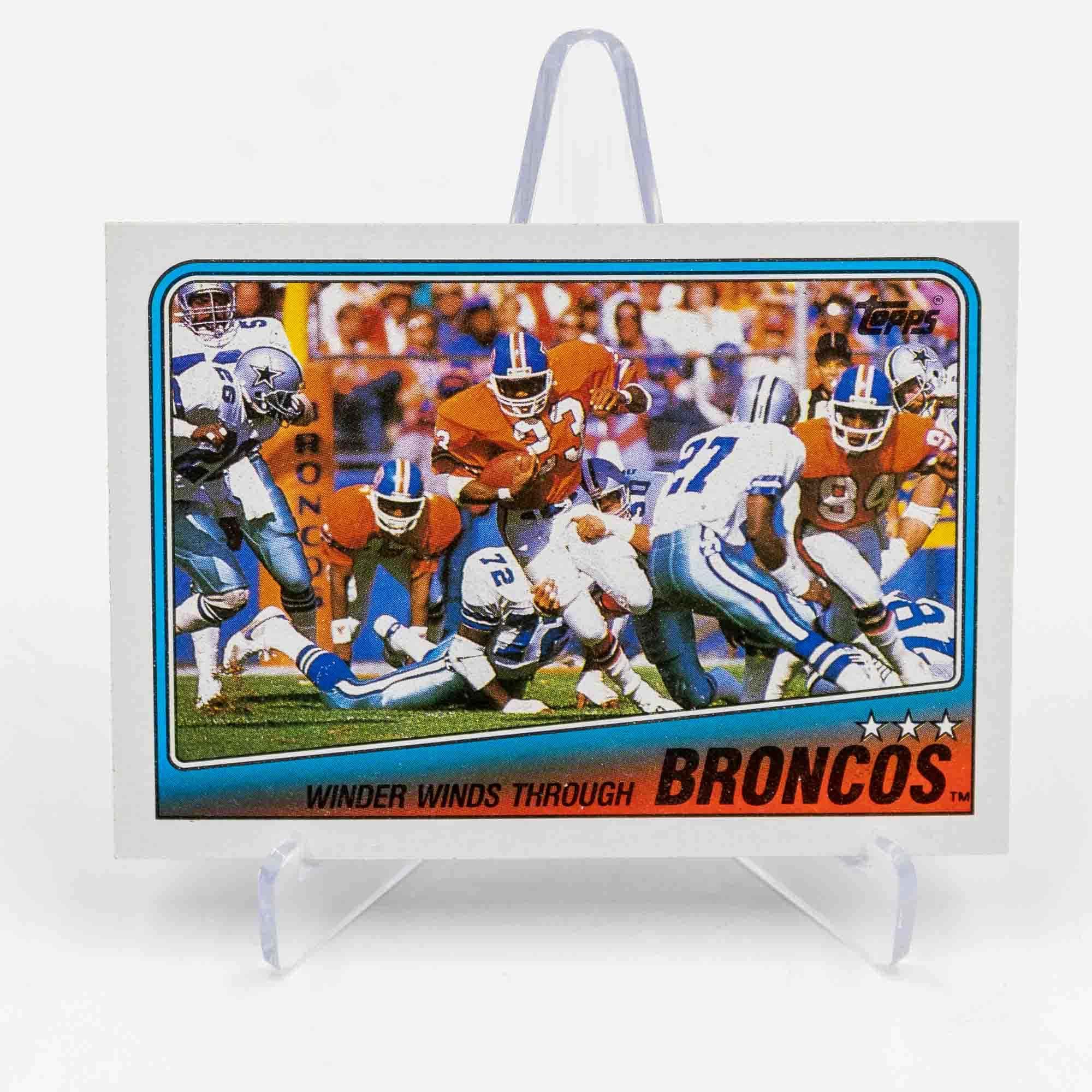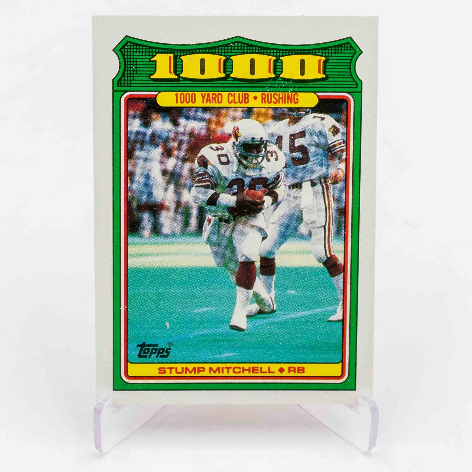 This 396-card, standard-size set was issued in 15-card wax packs. The wax packs also included an 1,000 yard club card. Card fronts feature a team helmet, player's name and position beneath the player photo. The borders surrounding the photo are in the colors of the team. The backs have highlights and yearly statistics. The set is ordered by how the teams finished. The Team Leader (TL) cards show an action scene for each team. Potential young stars are also designated by Topps as "Super Rookies." Rookie Cards.