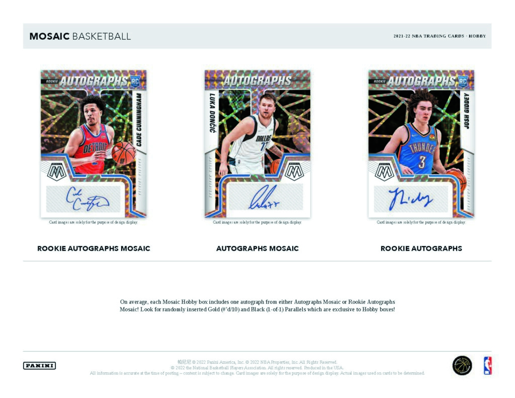 AUTOGRAPHS: On average, each Mosaic hobby box includes one autograph from either Autographs Mosaic or Rookie Autographs Mosaic! Find autographs from either Autographs Mosaic or Rookie Autographs Mosaic! Look for randomly inserted Gold (#'d/10) and Black (1-of-1) parallels which are exclusive to hobby boxes!