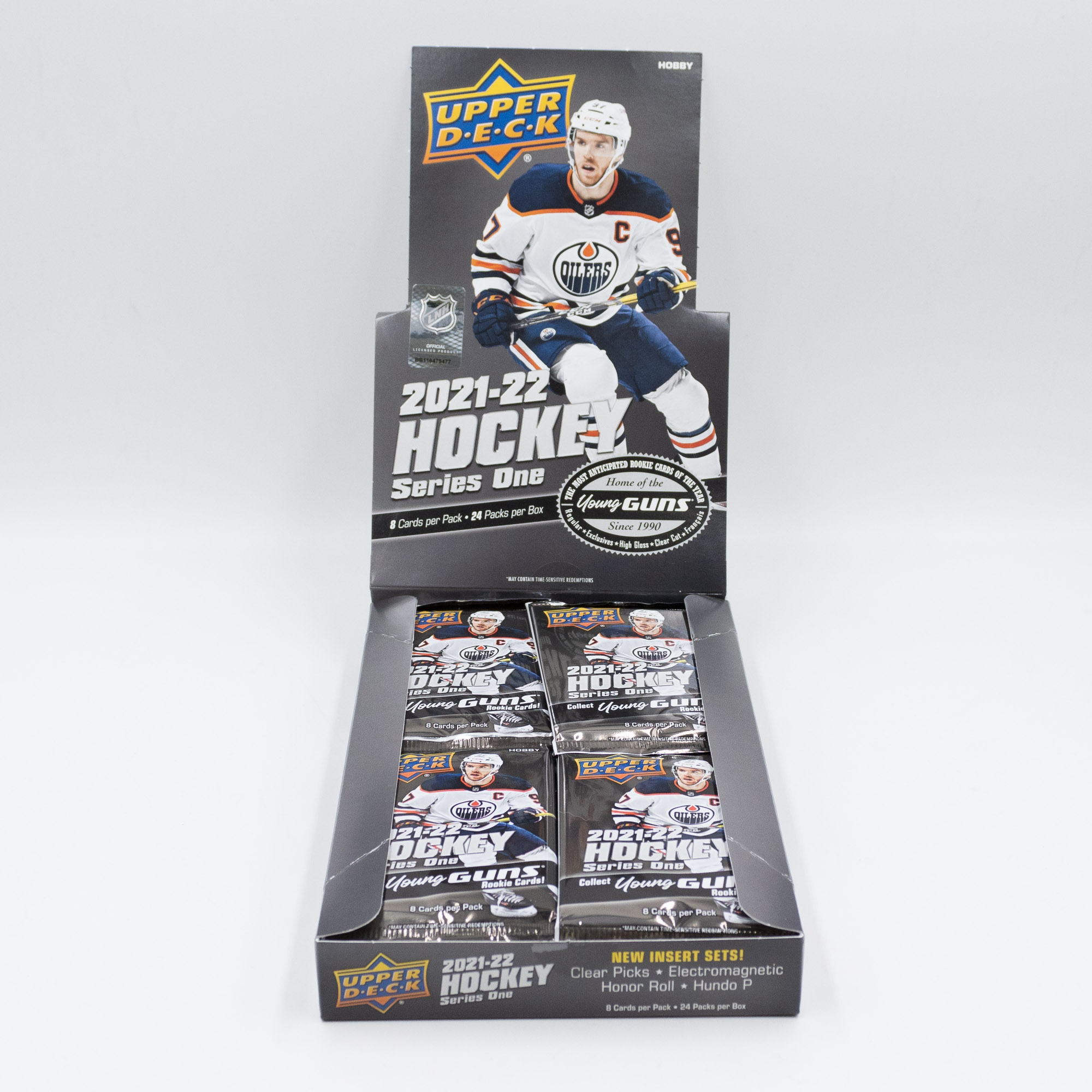Each Box Contains Six Regular Young Guns Cards, Six Debut Dates, Electromagnetic, Hundo P and/or Rookie Retrospective Cards, Four UD Canvas Cards, Two UD Portraits Cards, Two Honor Roll Cards, One Dazzlers - Blue Card, One Clear Cut Parallel, UD Game Jersey or Other Hit Card, One Base Set - French Parallel Card (includes Young Guns), and One Wildcard!
