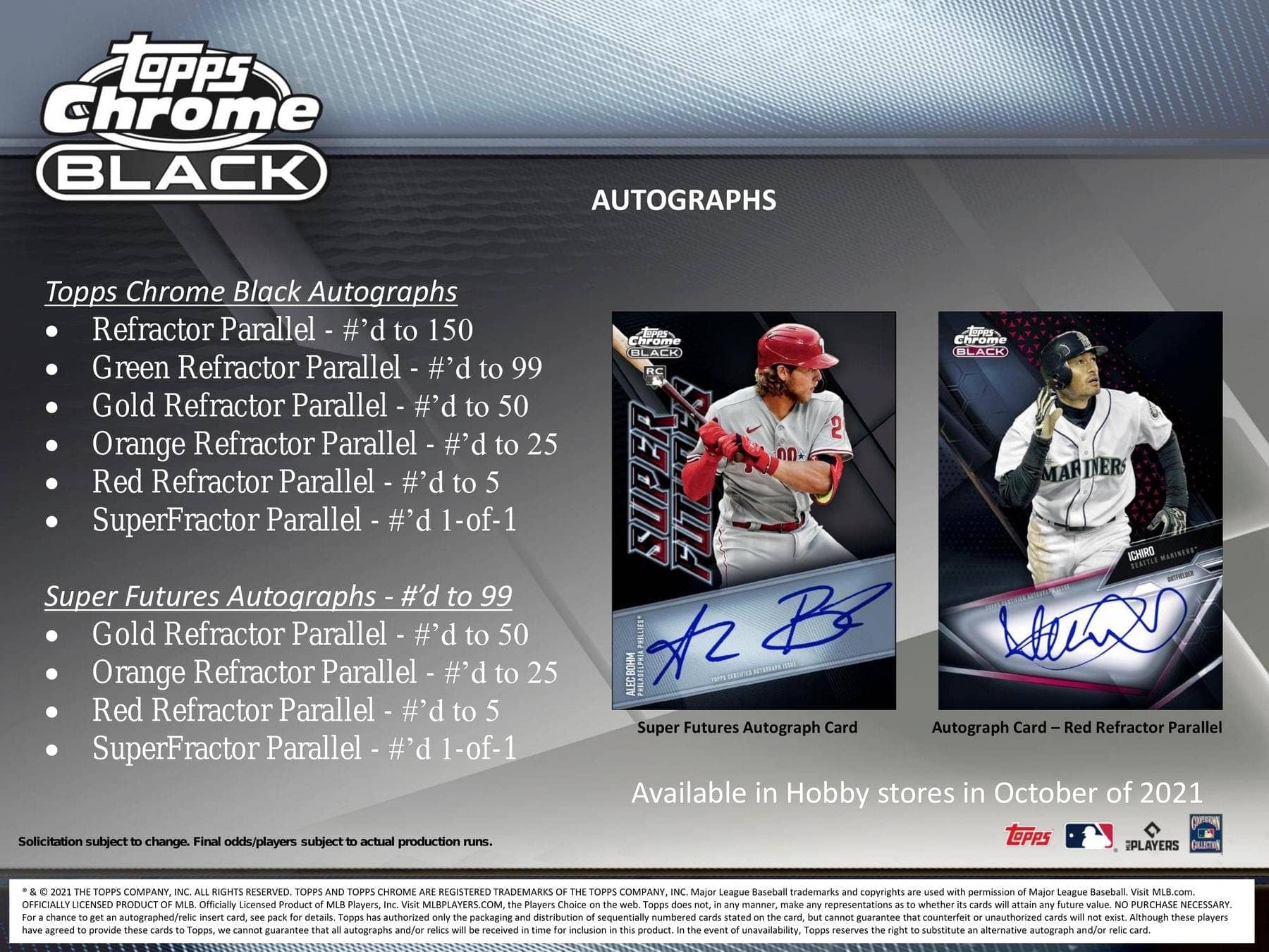 2021 Topps Chrome Black Baseball offers another year of premier Chrome elegance with an all-new checklist of Baseball legends, superstars, and a fresh crop of rookies.