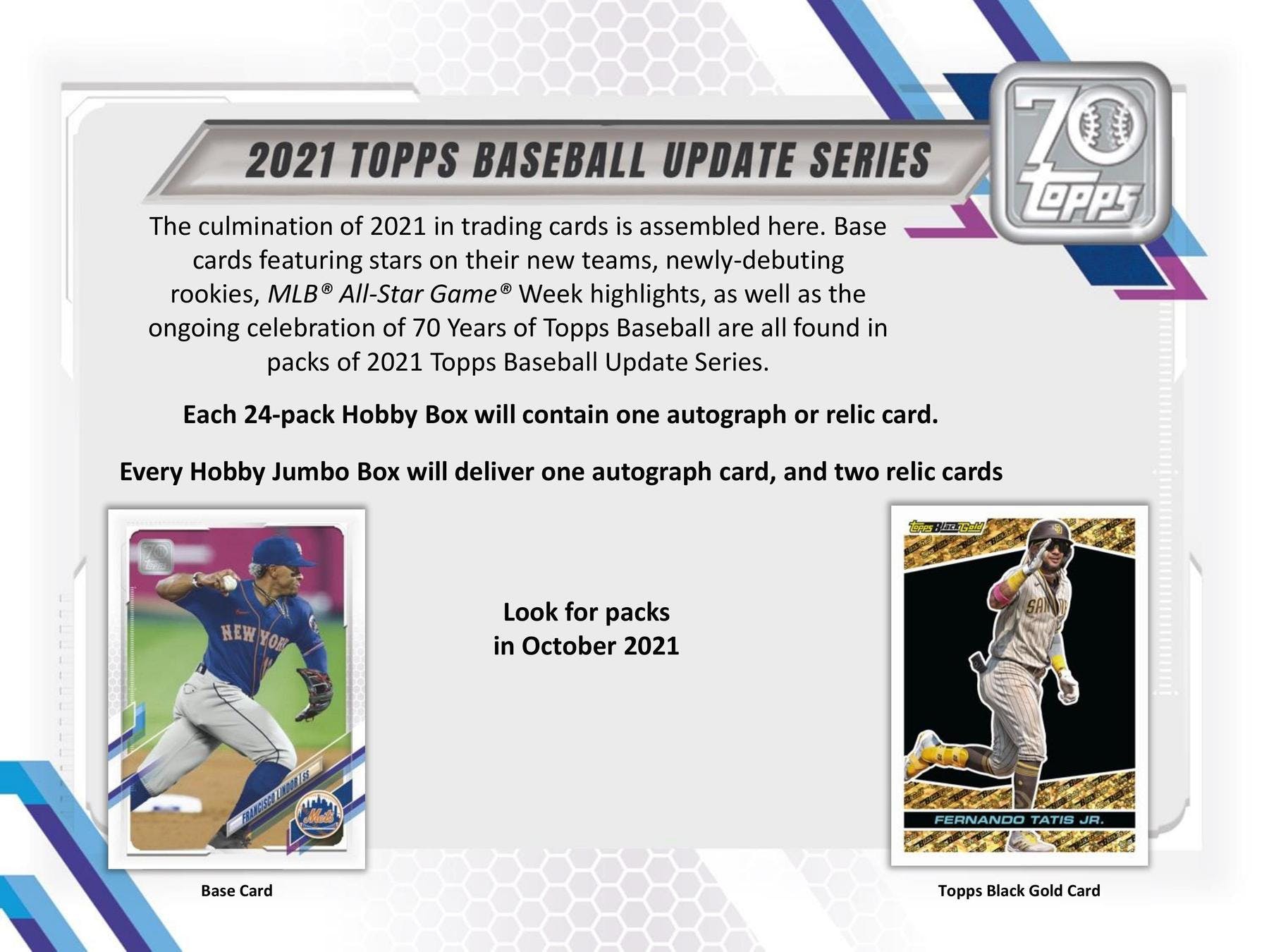 The culmination of 2021 in trading cards is assembled here. Base cards featuring stars on their new teams, newly-debuting rookies, MLB All-Star Game Week highlights, as well as the ongoing celebration of 70 Years of Topps Baseball are all found in packs of 2021 Topps Baseball Update Series.