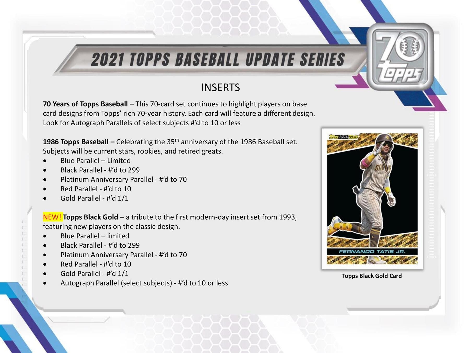 This 70-card set continues to highlight players on base card designs from Topps' rich 70-year history. Each card will feature a different design. Look for Autograph Parallels of select subjects #'d to 10 or less