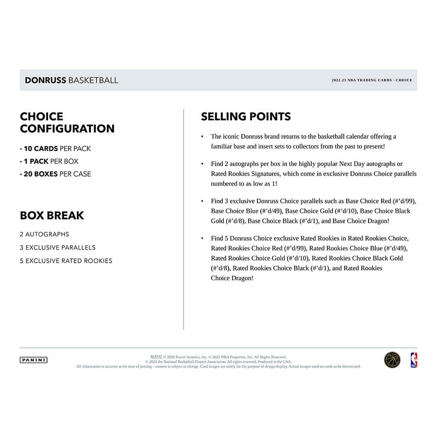 Find 2 autographs per box in the highly popular Next Day autographs or Rated Rookies Signatures, which come in exclusive Donruss Choice parallels numbered to as low as 1!