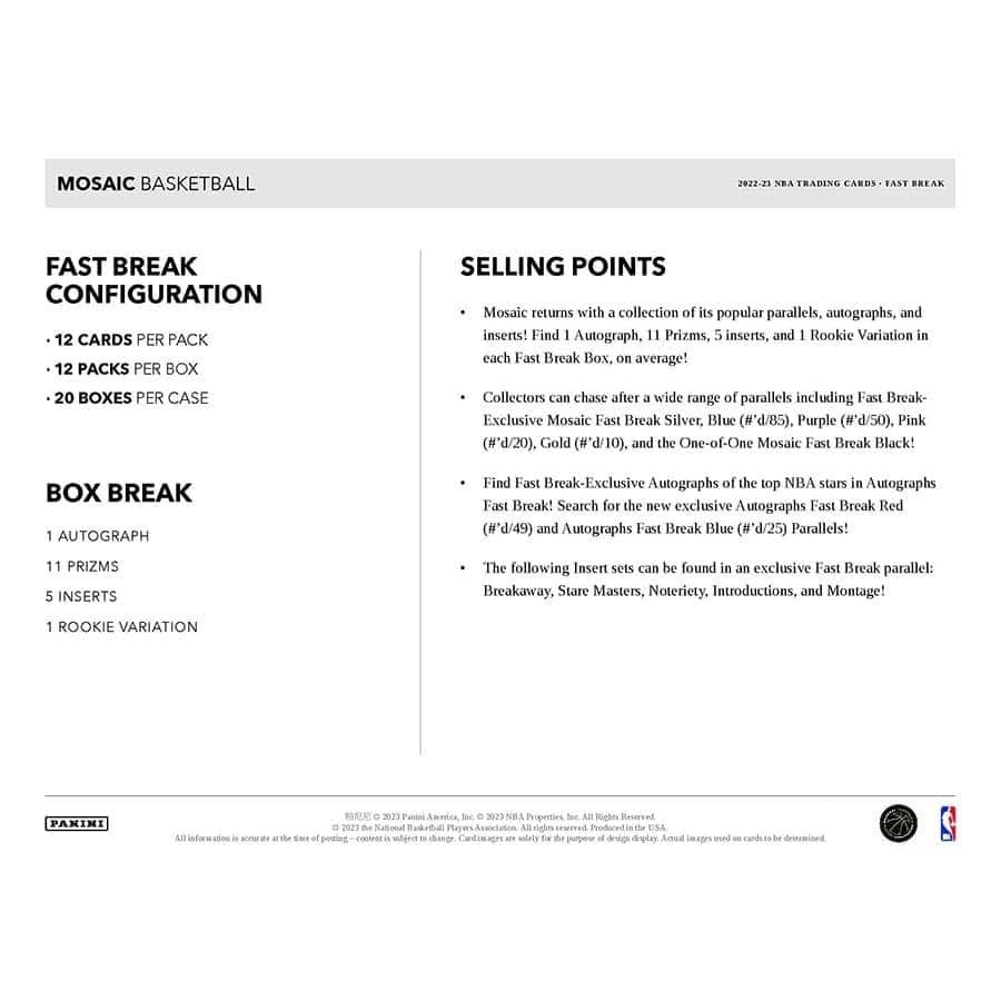 Mosaic returns with a collection of its popular parallels, autographs and inserts! Find 1 Autograph, 11 Prizms, 5 Inserts and 1 Rookie Variation in each Fast Break Box, on average!
