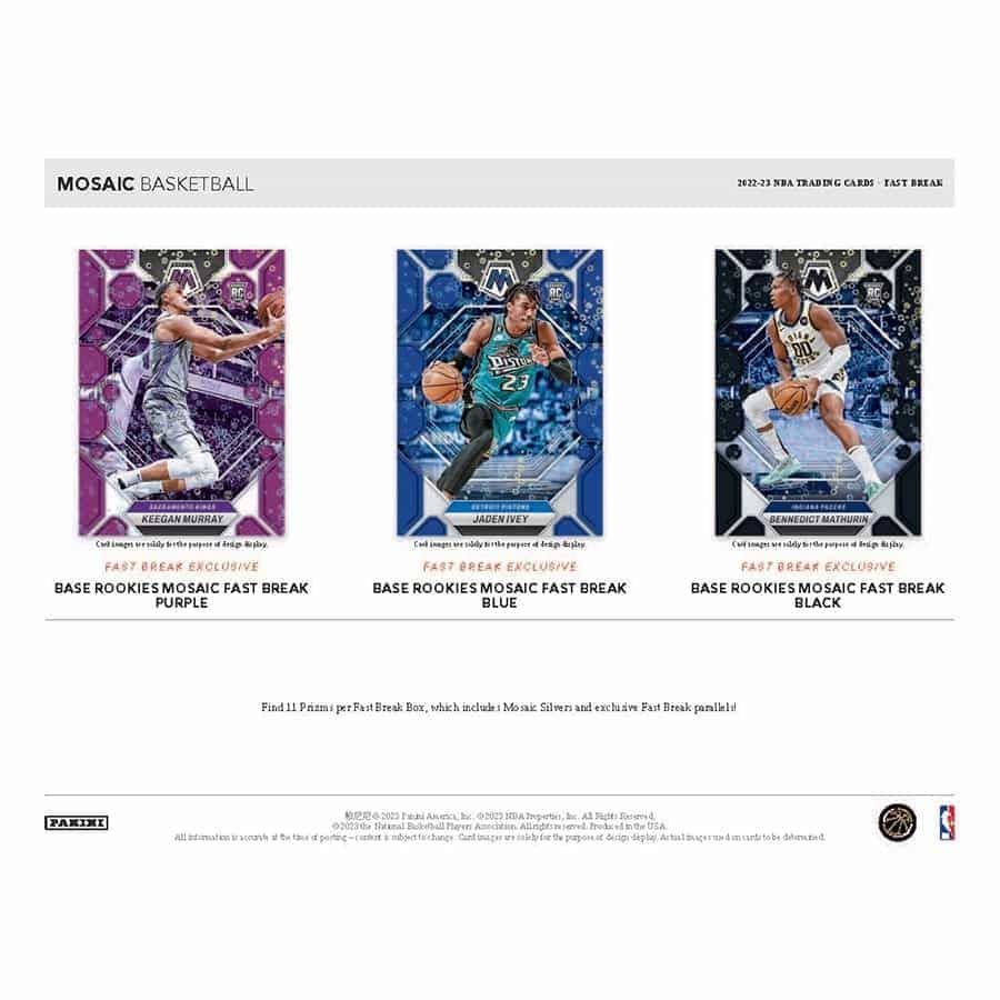 Collectors can chase after a wide range or parallels including Fast Break-Exclusive Mosaic Fast Break Silver, Blue (#' /85), Purple (#'d /50), Pink (#'d /20), Gold (#'d /10) and the One-of-One Fast Break Black!