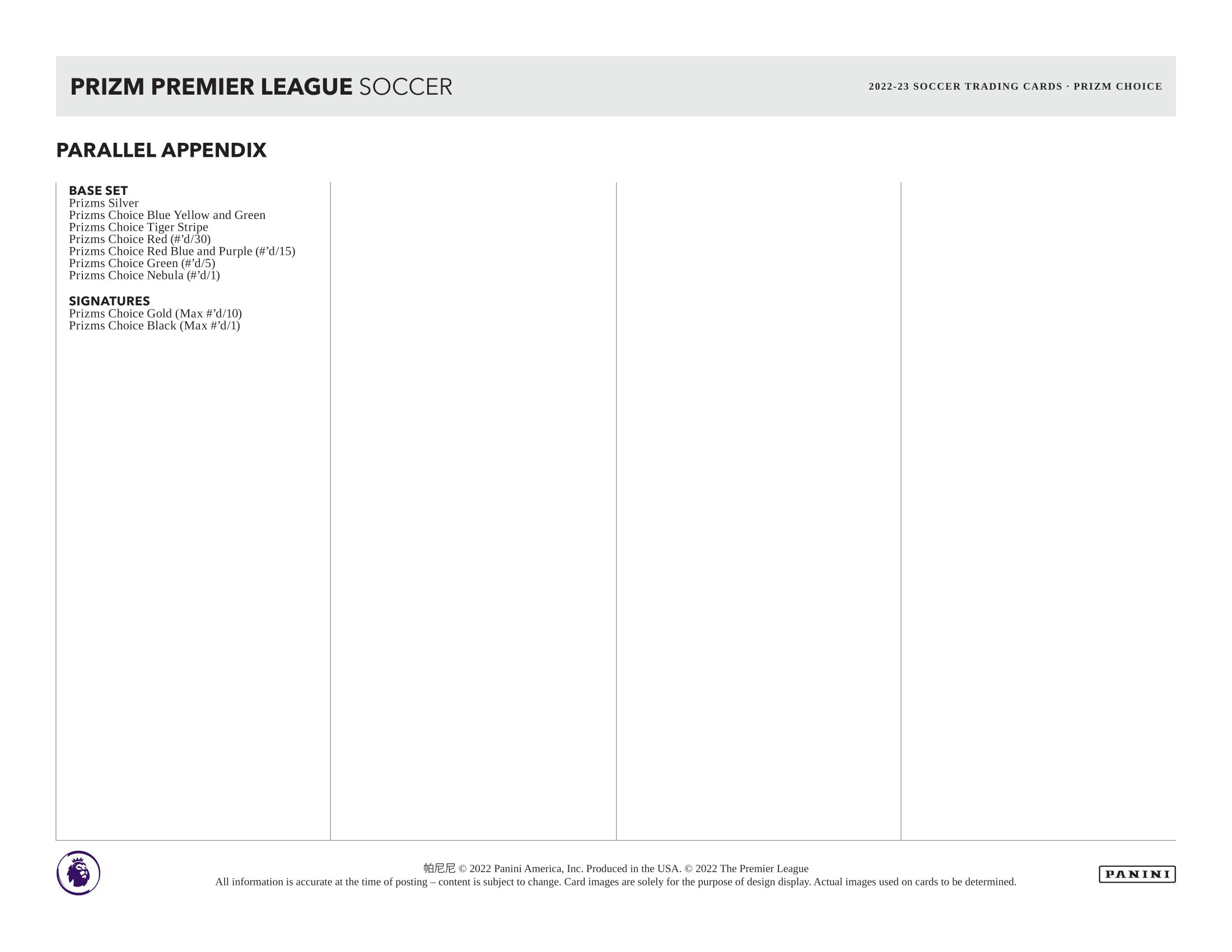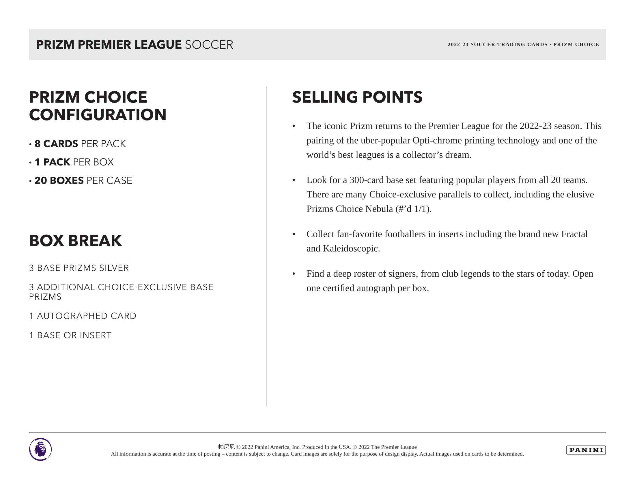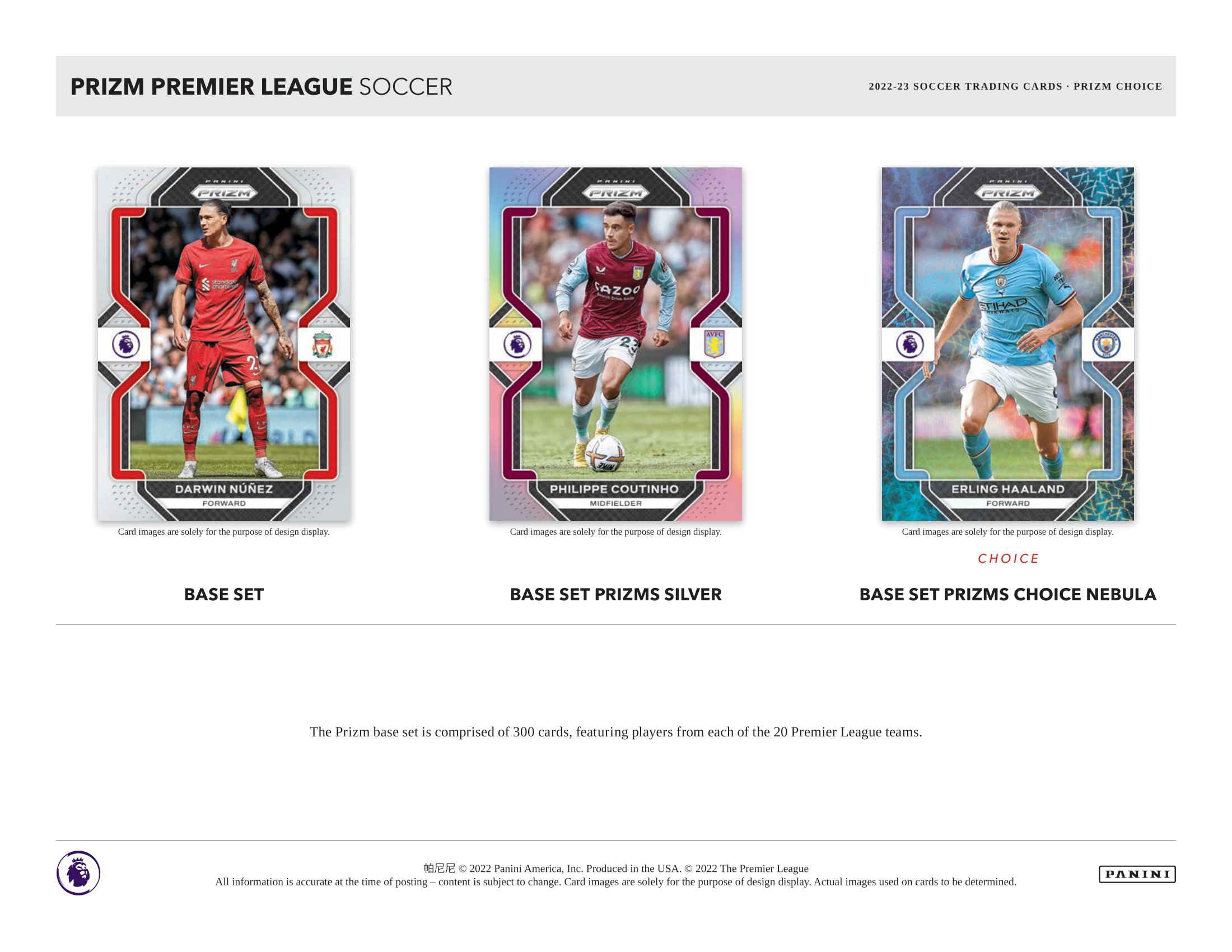 Look for a 300-Card Base Set featuring popular players from ALL 20 teams. There are many CHOICE-EXCLUSIVE parallels to collect, including the elusive Prizms Choice Nebula (#'d 1/1).